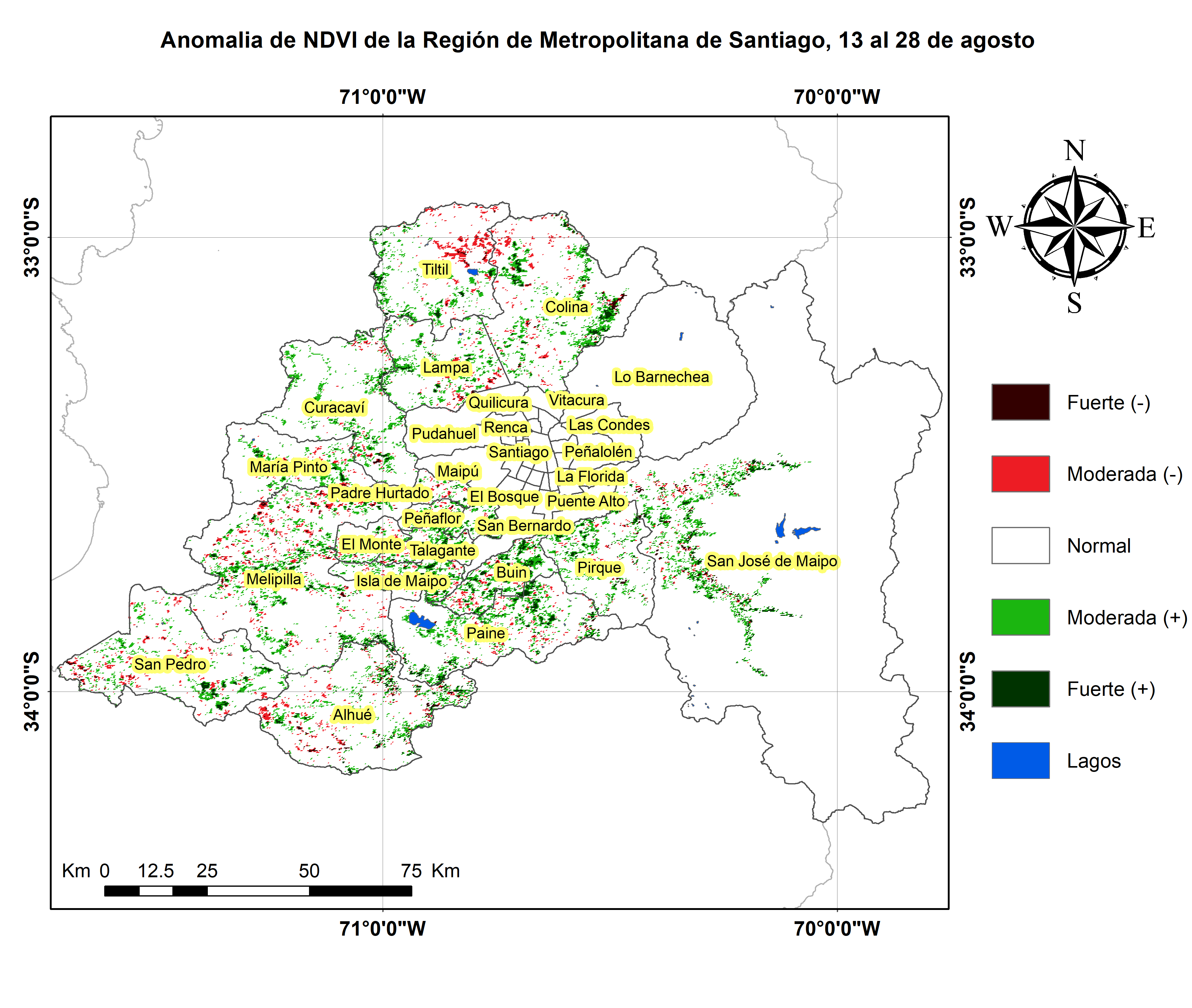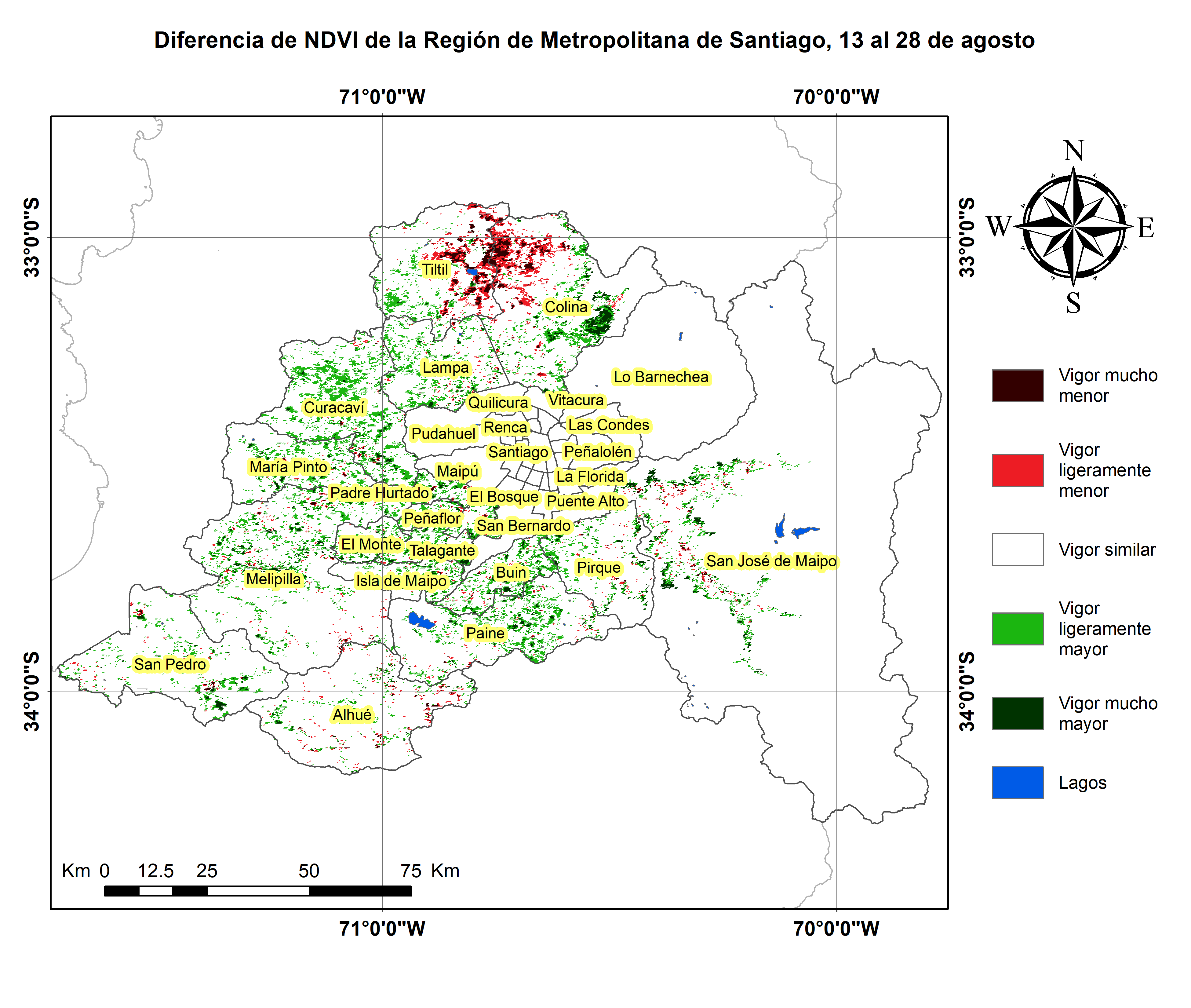Respecto de la respuesta fisiológica de las plantas al efecto del clima, las imágenes satelitales reflejan la magnitud del crecimiento o disminución de la cobertura vegetal en esta época del año mediante el índice de vegetación NDVI (Desviación Normalizada del Índice de Vegetación).