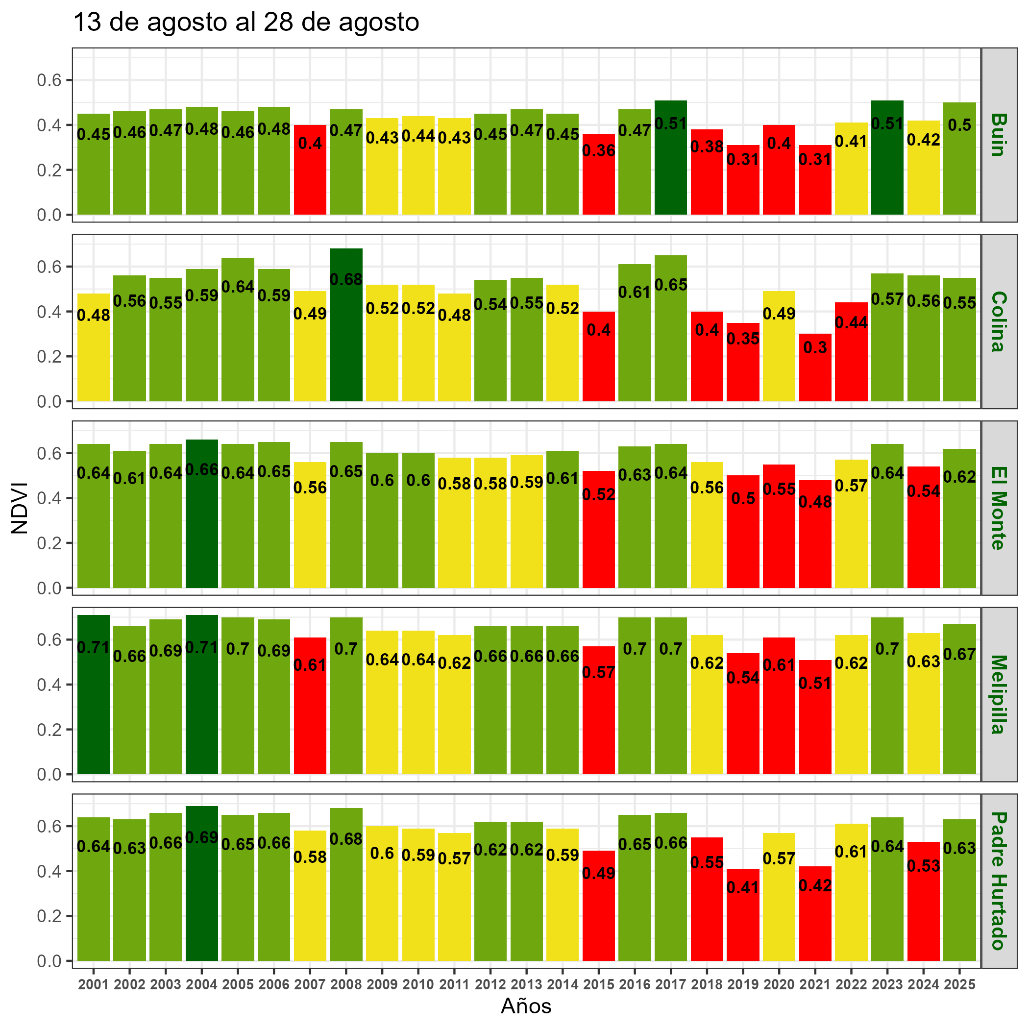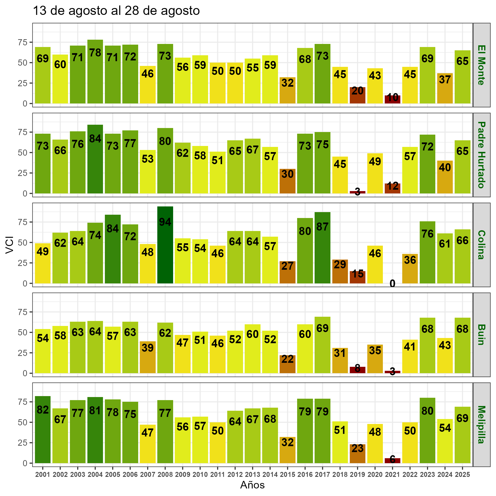 El Índice de Condición de la Vegetación (VCI) para la Región Metropolitana muestra un valor mediano del 72% entre el 13 y el 28 de agosto de 2025, lo que indica una condición favorable para el desarrollo agrícola. Comparado con el mismo período del año anterior, que registraba un 57%, la mejora es notable.