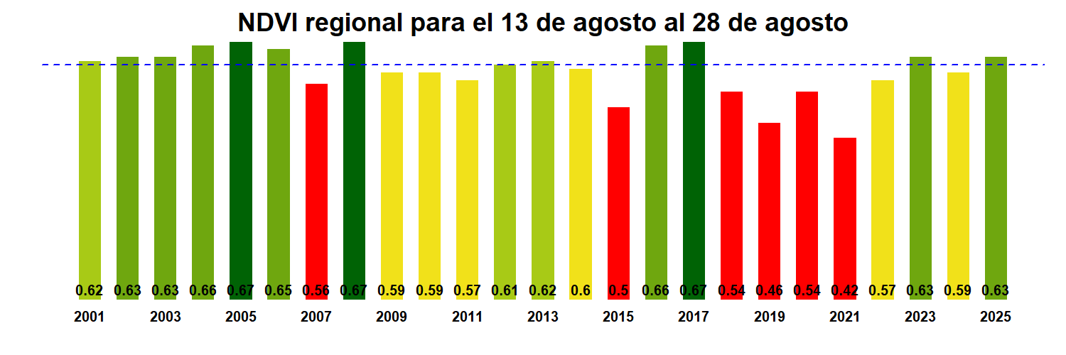Para esta quincena se observa un NDVI promedio regional de 0.63 mientras el año pasado había sido de 0.59. El valor promedio histórico para esta región, en este período del año es de 0.6.