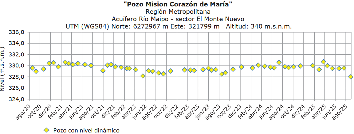 En el acuífero Río Maipo, sector El Monte Nuevo, el pozo Corazón de María se mantiene estable, con niveles dinámicos 328 m.s.n.m., presentando un descenso de 2 m lo que equivale a 18 m desde la superficie.