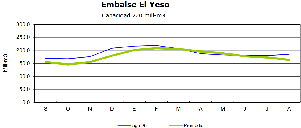 Finalmente, el Embalse El Yeso alcanzó al 31 de agosto un volumen de 185,6 millones de m³, lo que corresponde al 84% de su capacidad total. Este nivel representa un 13,6% más que en agosto de 2024 (163,5 millones m³) y un 1,8% superior al promedio histórico mensual (182 millones m³).