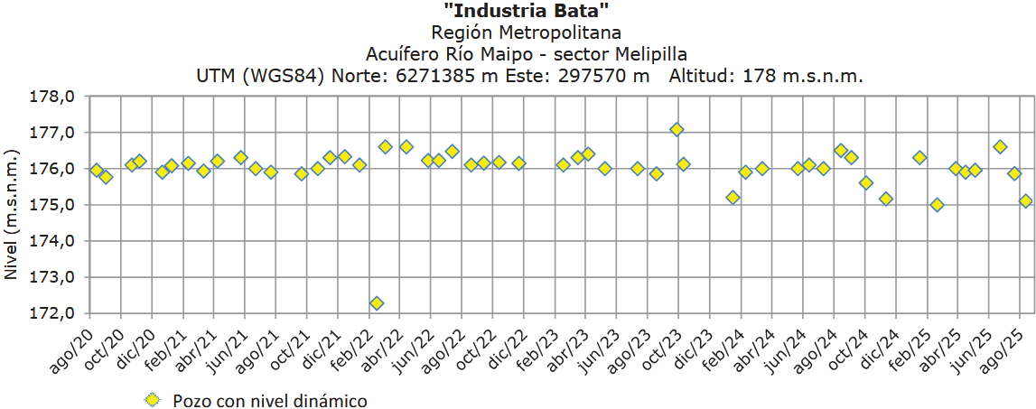 En el sector Melipilla, el pozo Industria Bata se mantiene con niveles dinámicos cercanos a los 175 m.s.n.m., equivalente a una profundidad de 3 m bajo la superficie, dentro del rango estable de los últimos años.