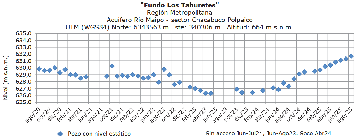 En el sector Chacabuco/Polpaico, el pozo Fundo Los Tahuretes continúa con un claro proceso de recuperación, alcanzando en agosto 2025 un nivel estático cercano a los 632 m.s.n.m., reafirmando la tendencia al alza registrada durante este año.