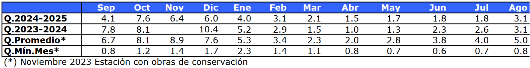 Para el período de agosto en la estación Los Almendros de Río Mapocho, el caudal fue de 3,1 m3/s, lo que representa un valor 38,0% menor respecto al promedio histórico de este mes (5,0 m3/s) y similar al registro de agosto de 2024 (3,1 m3/s). En comparación con julio de 2025 (1,8 m3/s), se observa un aumento mensual de 72%.