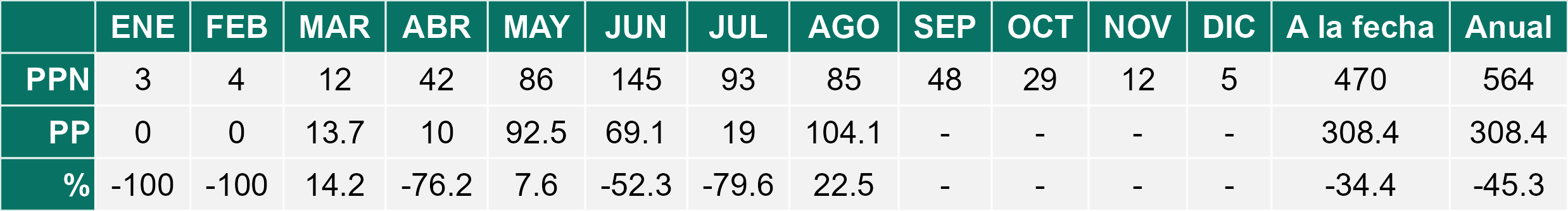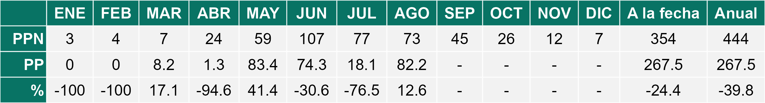 En cuanto a precipitaciones, se acumularon 45,3 mm, lo que equivale al 82,4% del valor normal para este mes. Entre enero y agosto el total llega a 195,4 mm, frente a los 270 mm que se esperan en un año normal, lo que representa un déficit de 27,6%. En comparación, en el mismo período de 2024 se habían registrado 102,1 mm.