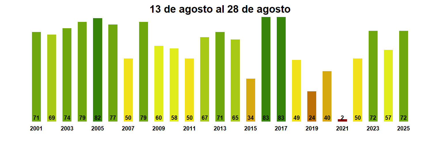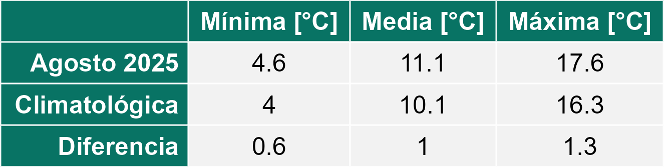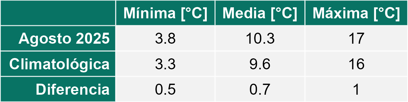 En cuanto a lluvias, se acumularon 82,2 mm, lo que equivale al 112,6% de lo normal para el mes. El total de enero a agosto alcanza 267,5 mm, frente a los 354 mm que se esperarían en un año normal, reflejando un déficit de 24,4%. A la misma fecha de 2024 se habían registrado 86,4 mm.