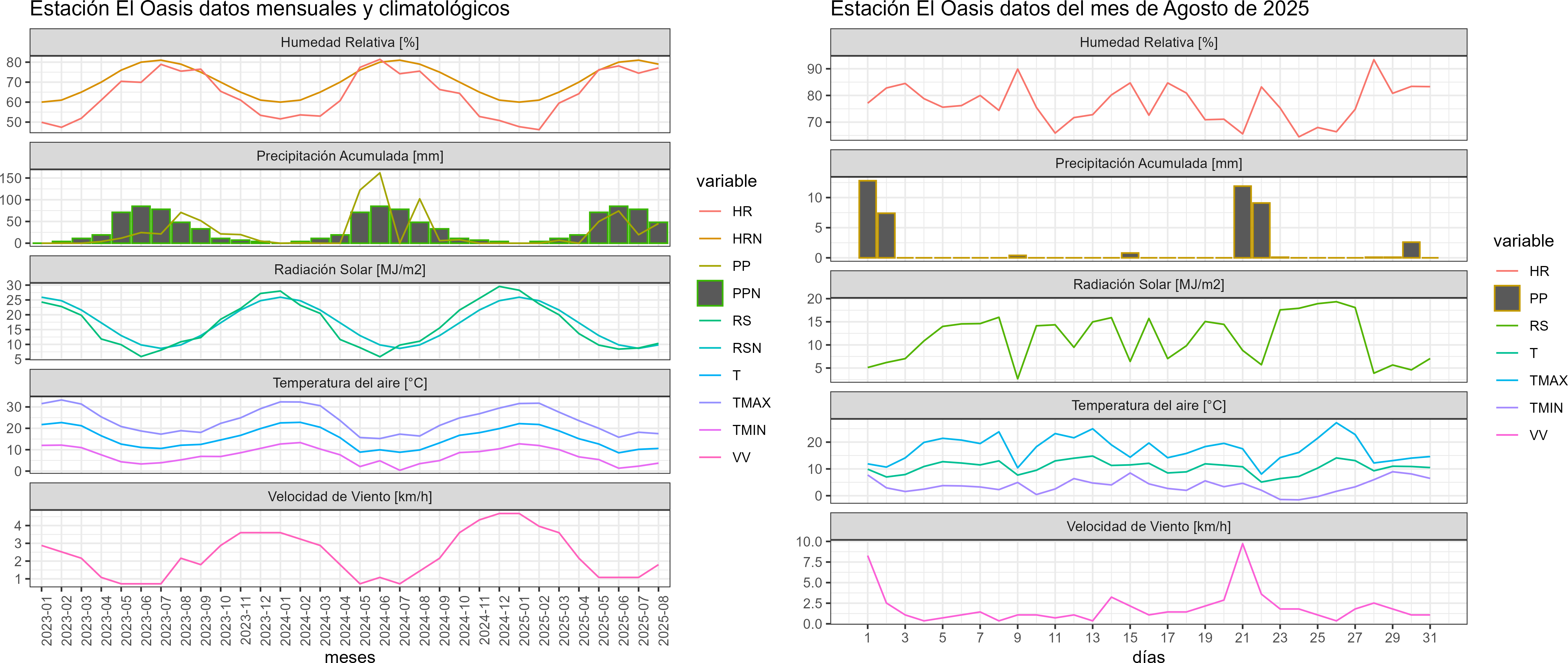 La estación El Oasis corresponde al distrito agroclimático 13-2. Sus valores climatológicos de referencia son: mínima 3,7 °C, media 11,2 °C y máxima 18,8 °C.