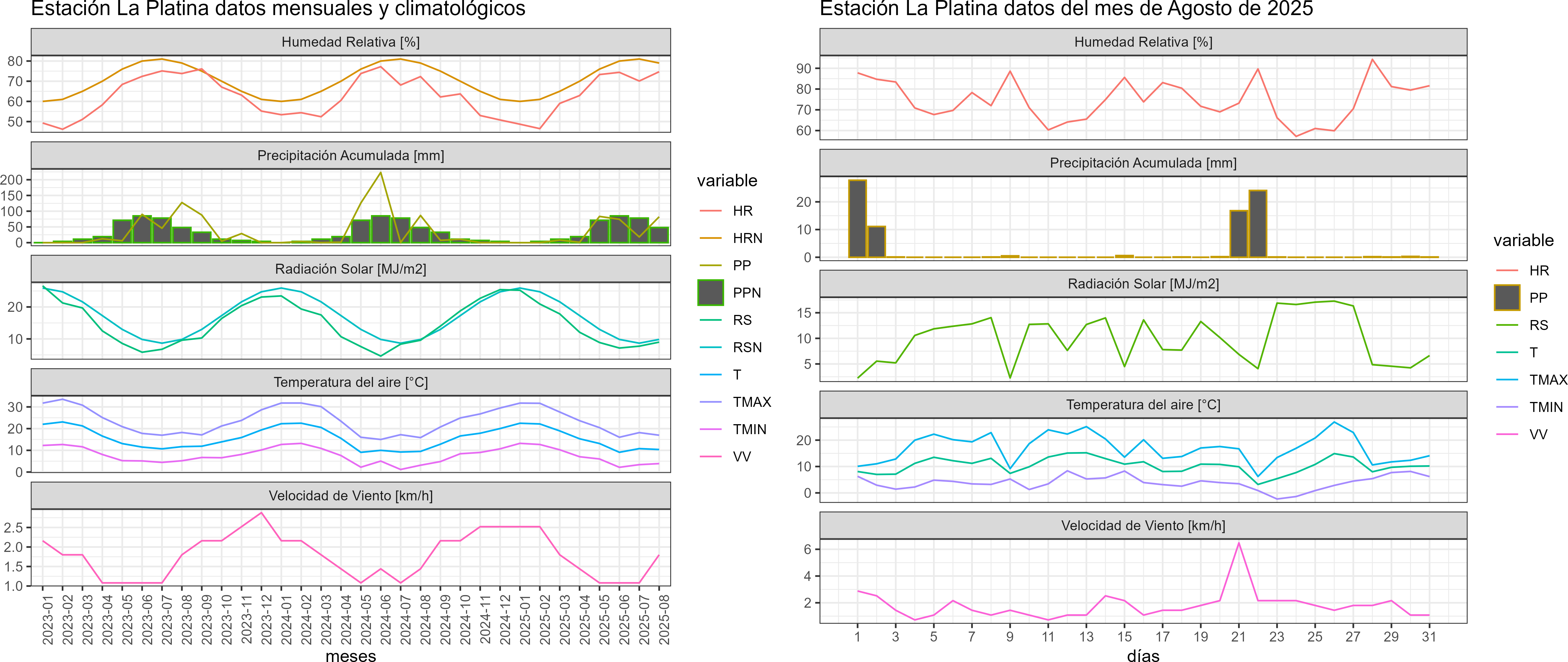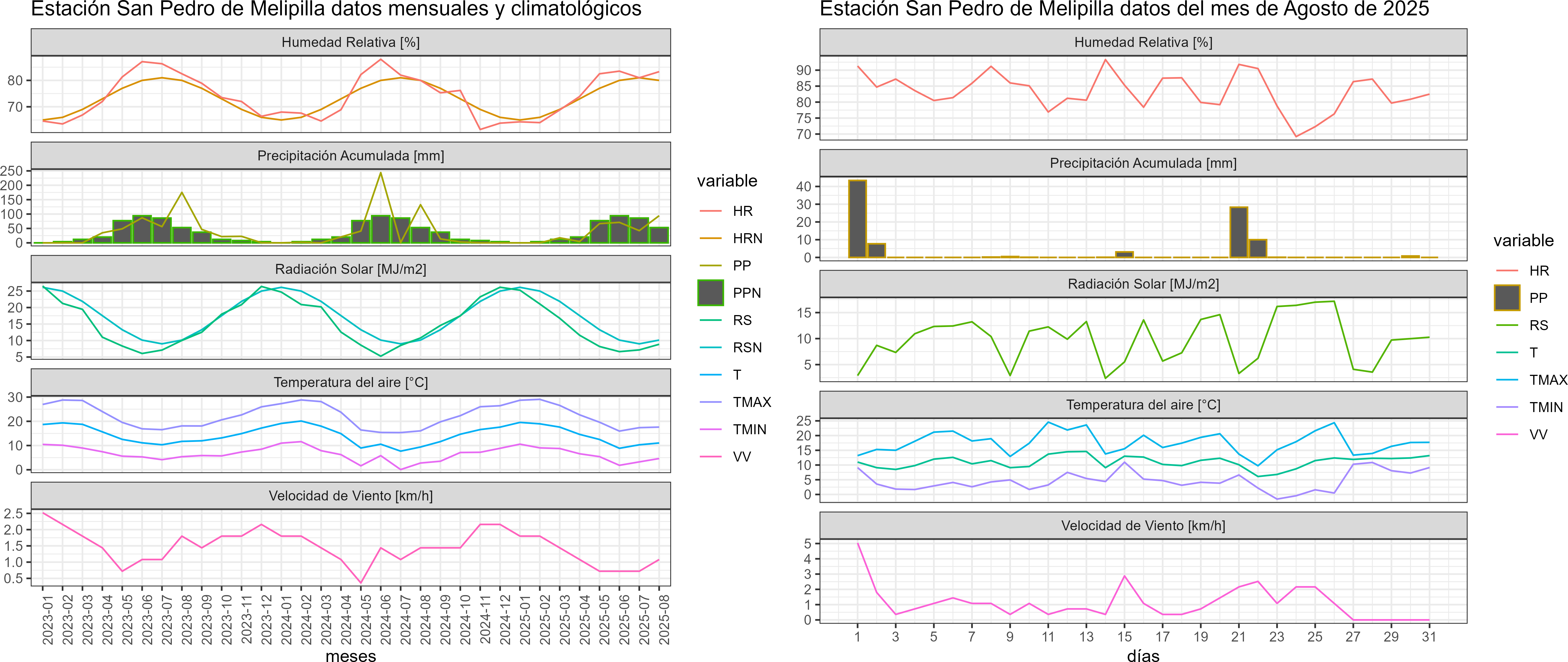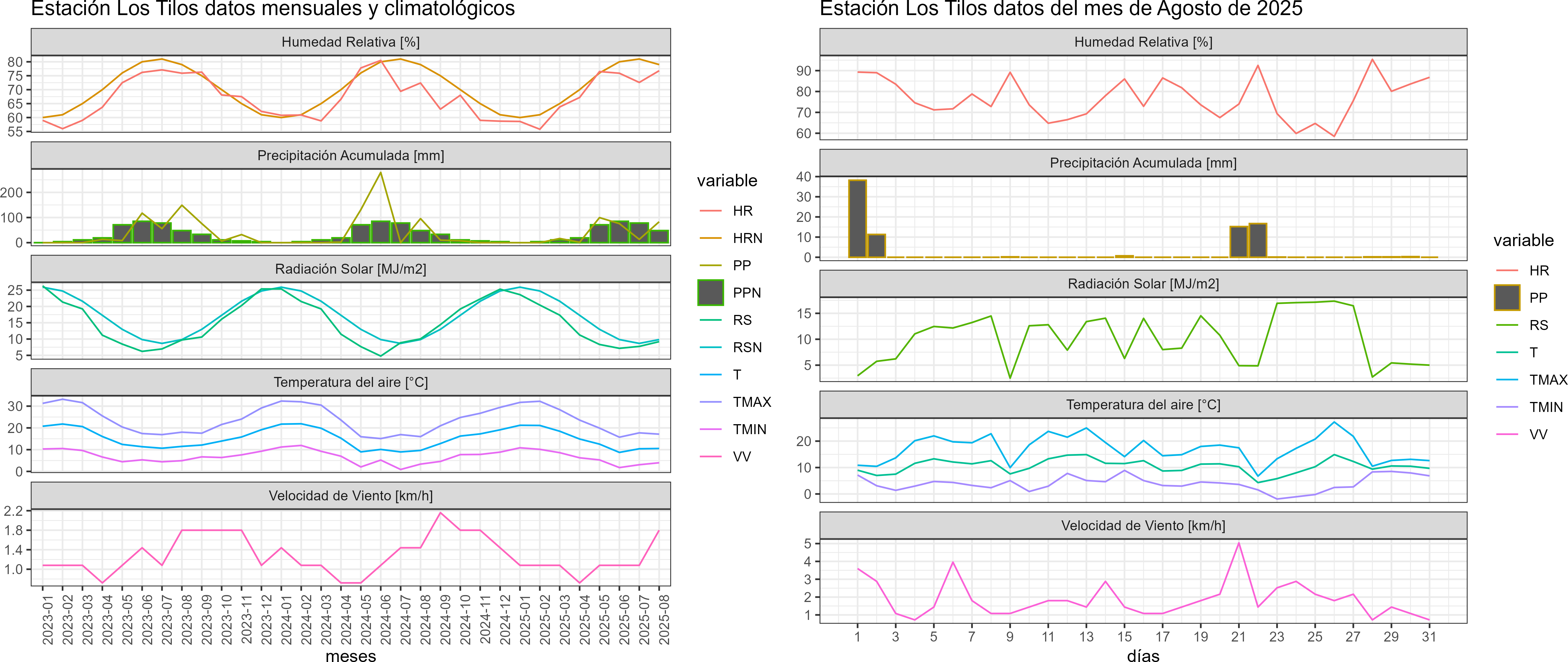 En precipitación, se registraron 83,1 mm, lo que corresponde al 107,9% de un año normal para agosto. El acumulado entre enero y agosto es de 289,7 mm, mientras que lo esperado serían 378 mm, lo que refleja un déficit de 23,4%. En la misma fecha de 2024 se habían acumulado 95,7 mm.