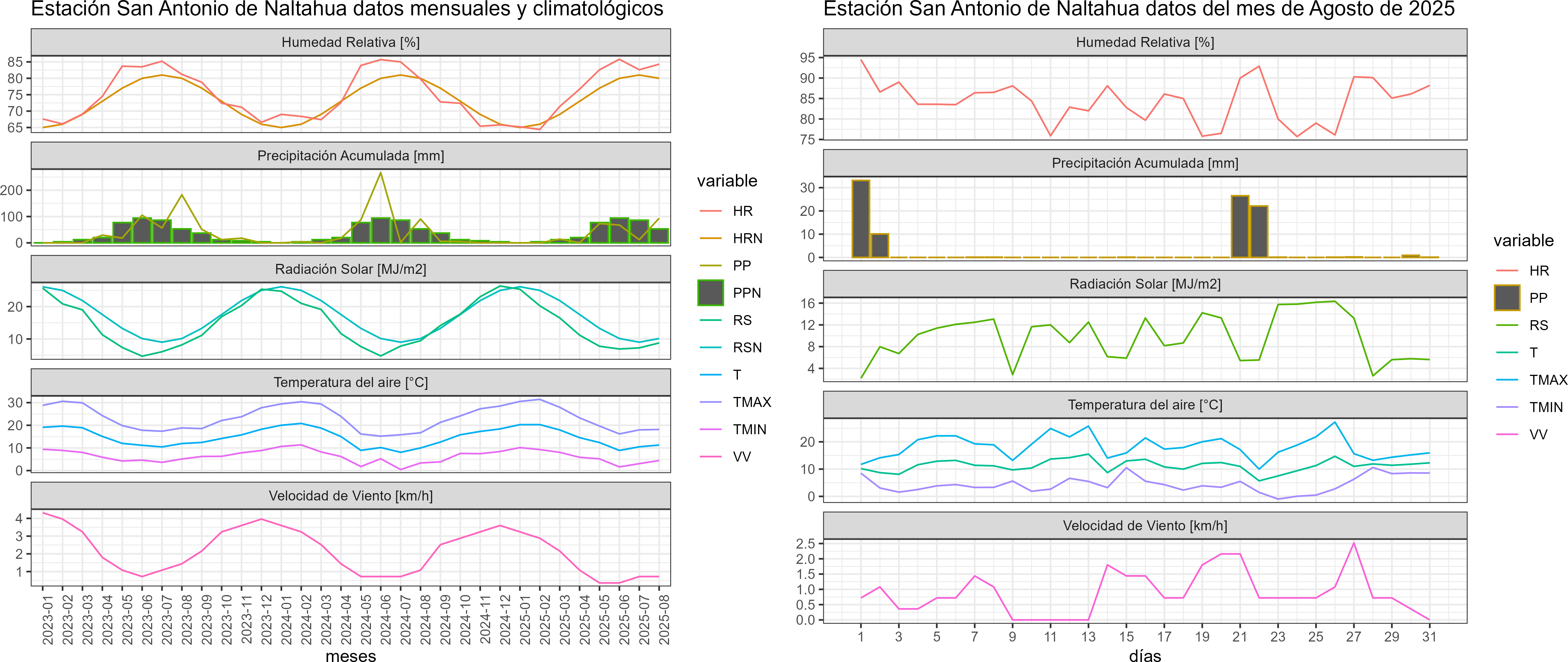 La estación San Antonio de Naltahua se ubica en el distrito agroclimático 13-1. Sus valores climatológicos de referencia son: mínima 3,7 °C, media 10,9 °C y máxima 18,1 °C.