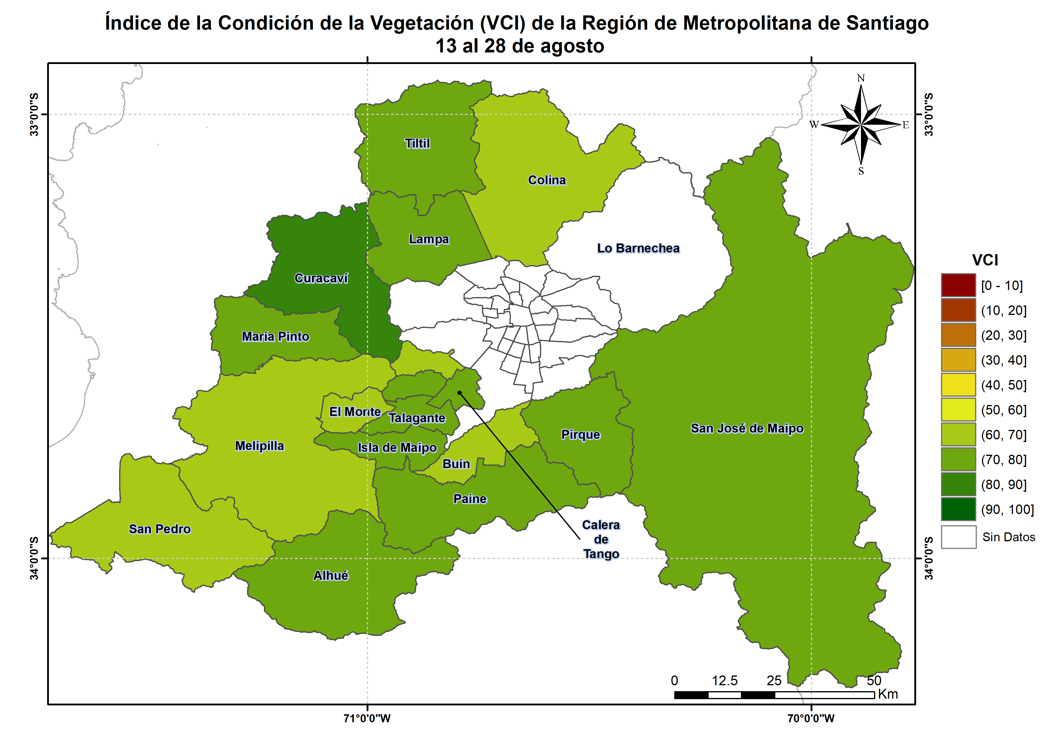 En términos globales la Región presentó un valor mediano de VCI de 72% para el período comprendido desde el 13 al 28 de agosto. A igual período del año pasado presentaba un VCI de 57% (Fig. 1). De acuerdo a la Tabla 1 la Región Metropolitana, en términos globales presenta una condición Favorable.