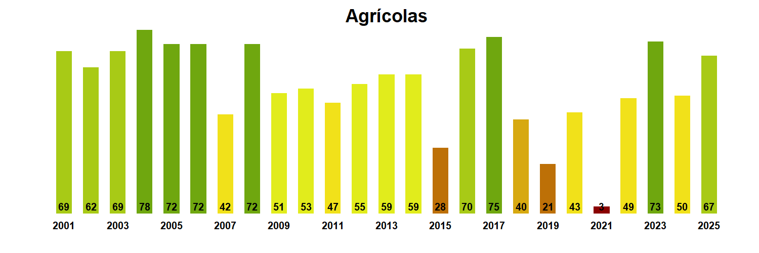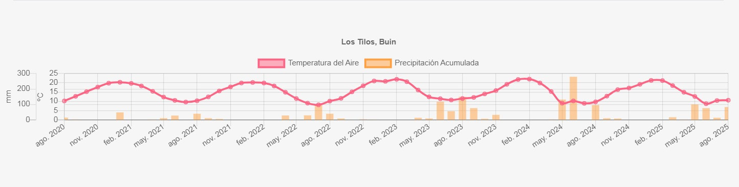 Respecto a las precipitaciones, en agosto se acumularon 104,1 mm, lo que corresponde a un 122,5% del valor normal para este mes. Entre enero y agosto de 2025, el total acumulado alcanza 308,4 mm, mientras que en un año normal se registrarían alrededor de 470 mm, lo que representa un déficit del 34,4%.