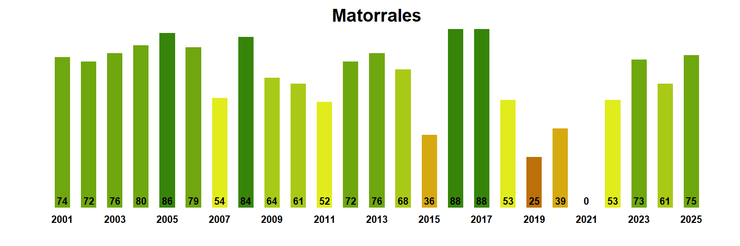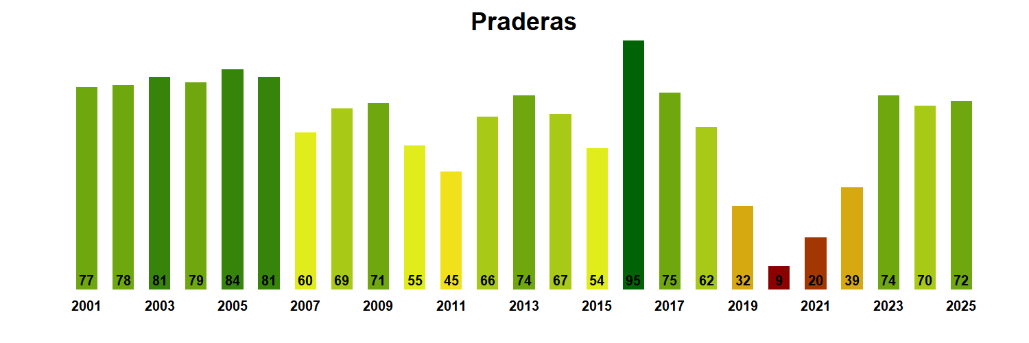 Las praderas naturales muestran un buen crecimiento, impulsado por las temperaturas moderadas y la humedad residual del suelo. Esto asegura una buena disponibilidad de forraje para los sistemas de pastoreo extensivo durante la primavera y el inicio del verano. En la apicultura, las colmenas están creciendo activamente gracias a una abundante oferta de alimento, por lo que se recomienda monitorear el estado sanitario de las colmenas.