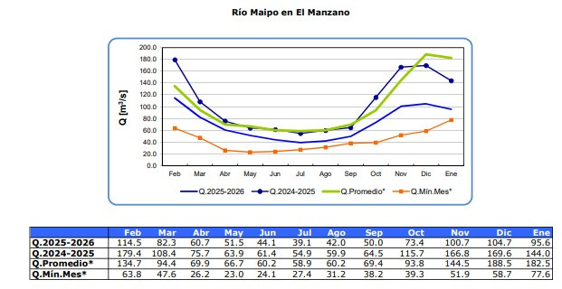 Los registros para el período de Enero 2026 en la estación El Manzano de Rio Maipo el caudal es de 95,6 m3/seg y representa 47 % bajo el caudal promedio histórico del respectivo mes . (DGA)