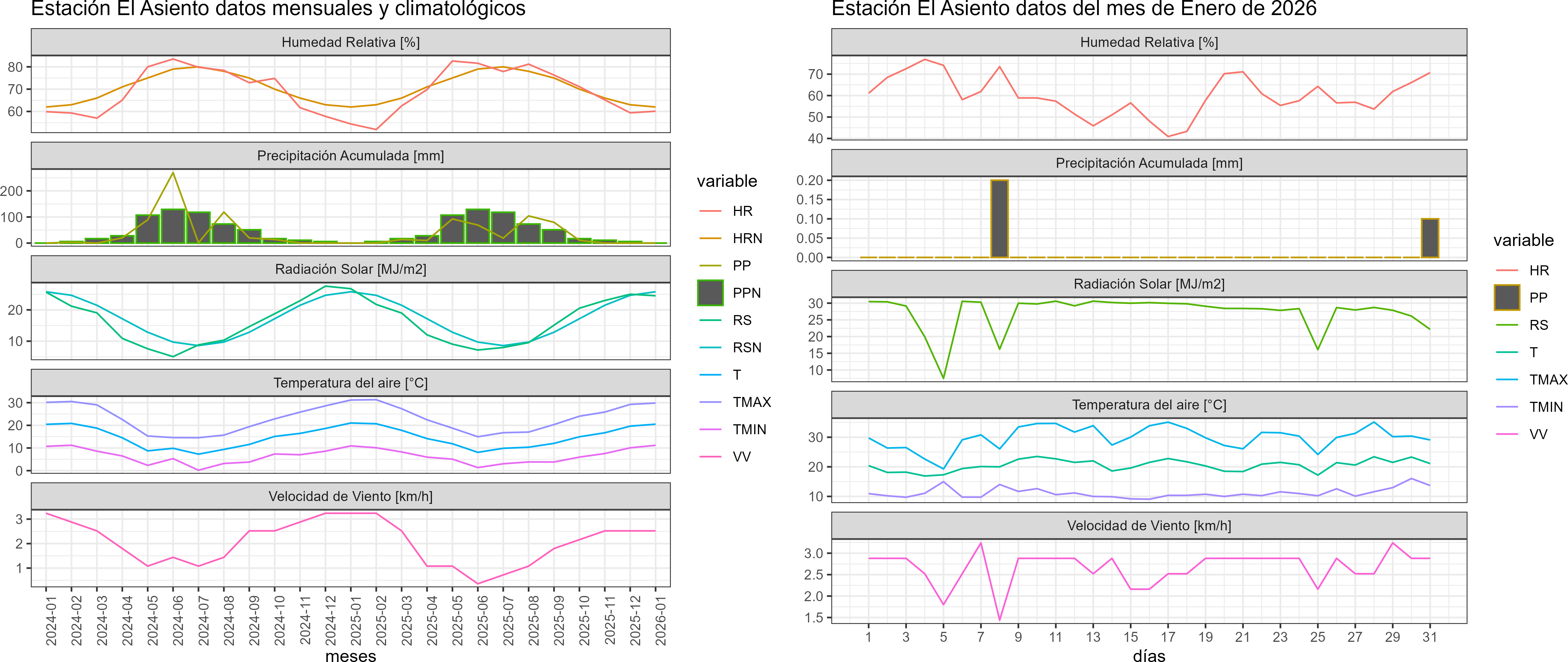 La estación El Asiento corresponde al distrito agroclimático 13-6-1. Para este distrito climático la temperatura mínima, media y máxima climatológicas alcanzan los 11.6°C, 20.3°C y 28.9°C respectivamente. Por su parte, respecto a las temperaturas medidas durante el mes de enero en la estación: la temperatura mínima alcanzo los 11.2°C (-0.4°C bajo la climatológica), la temperatura media 20.5°C (0.2°C sobre la climatológica) y la temperatura máxima llegó a los 29.8°C (0.9°C sobre la climatológica). Las temperaturas extremas fueron 9,1 °C y 35,1 °C respectivamente.