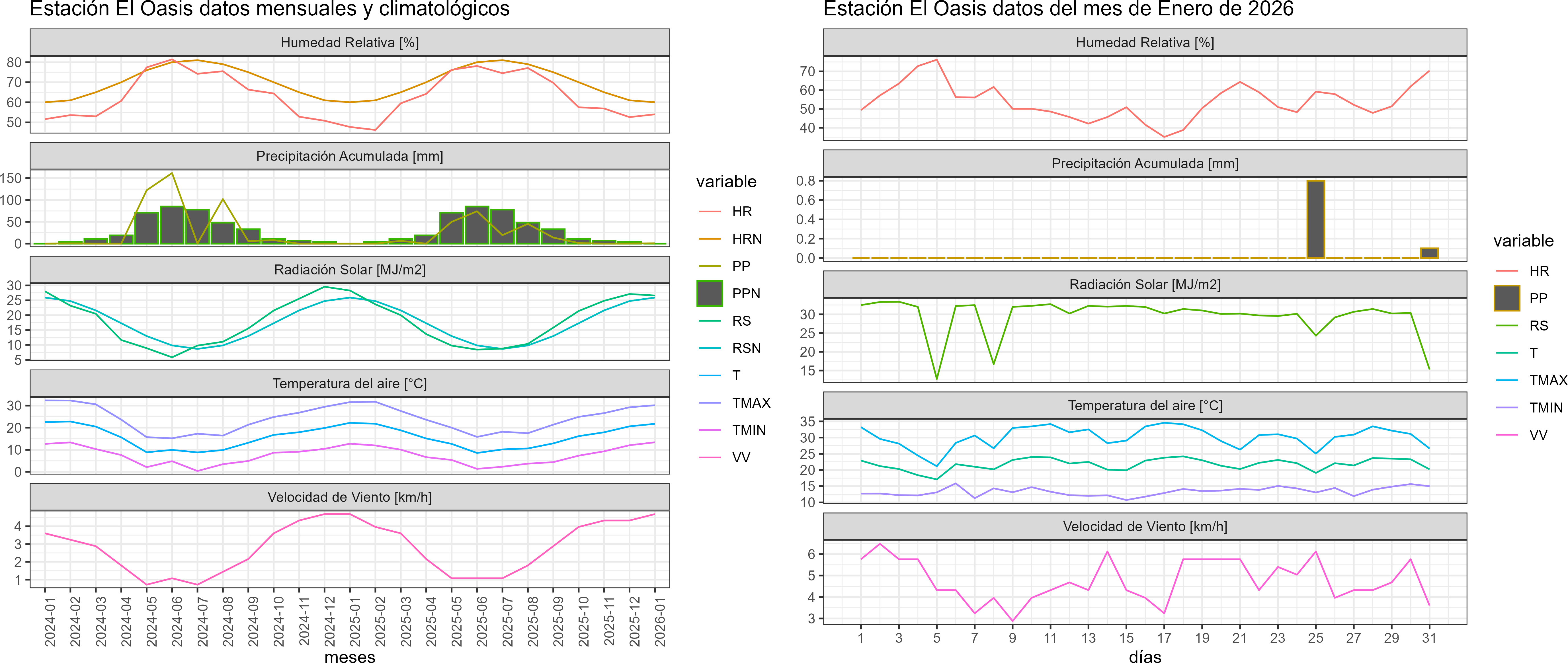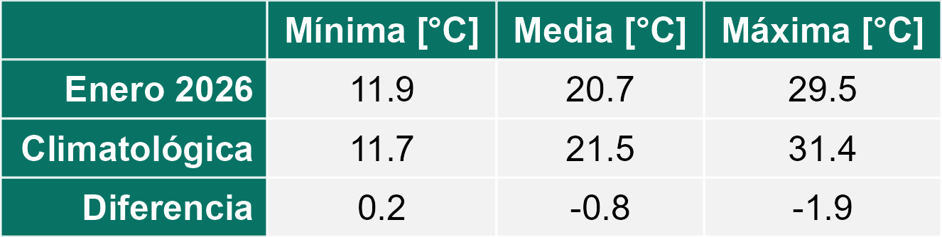La estación El Oasis corresponde al distrito agroclimático 13-2. Para este distrito climático la temperatura mínima, media y máxima climatológicas alcanzan los 11.6°C, 21.7°C y 31.7°C respectivamente. Por su parte, respecto a las temperaturas medidas durante el mes de enero en la estación: la temperatura mínima alcanzo los 13.4°C (1.8°C sobre la climatológica), la temperatura media 21.8°C (0.1°C sobre la climatológica) y la temperatura máxima llegó a los 30.2°C (-1.5°C bajo la climatológica). Las temperaturas extremas fueron 10,7 °C y 34,6 °C respectivamente.