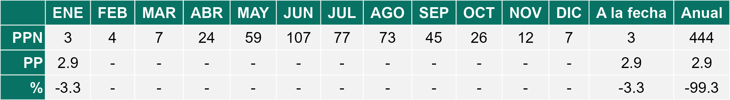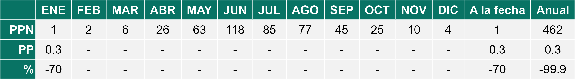 En el mes de enero se registró una pluviometría de 0.3 mm, lo cual representa un 30% con respecto al mismo mes de un año normal. De enero a enero se ha registrado un total acumulado de 0.3 mm, en circunstancias que un año normal registraría a la fecha 1 mm, lo que representa un déficit de 70%. A la misma fecha, durante el año 2024 la precipitación alcanzaba los 0 mm.