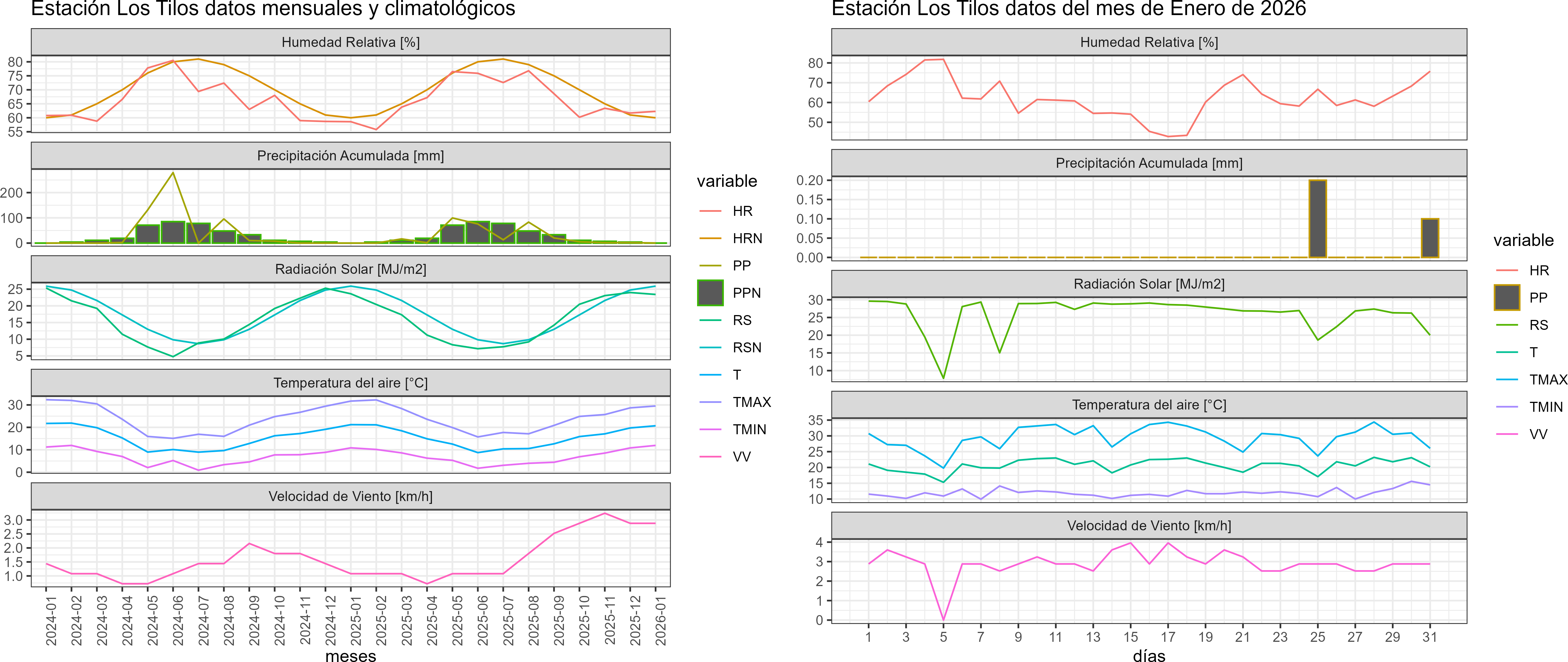 La estación Los Tilos corresponde al distrito agroclimático 13-2. Para este distrito climático la temperatura mínima, media y máxima climatológicas alcanzan los 11.7°C, 21.5°C y 31.4°C respectivamente. Por su parte, respecto a las temperaturas medidas durante el mes de enero en la estación: la temperatura mínima alcanzo los 11.9°C (0.2°C sobre la climatológica), la temperatura media 20.7°C (-0.8°C bajo la climatológica) y la temperatura máxima llegó a los 29.5°C (-1.9°C bajo la climatológica). Las temperaturas extremas fueron 10,0 °C y 34,4 °C respectivamente.