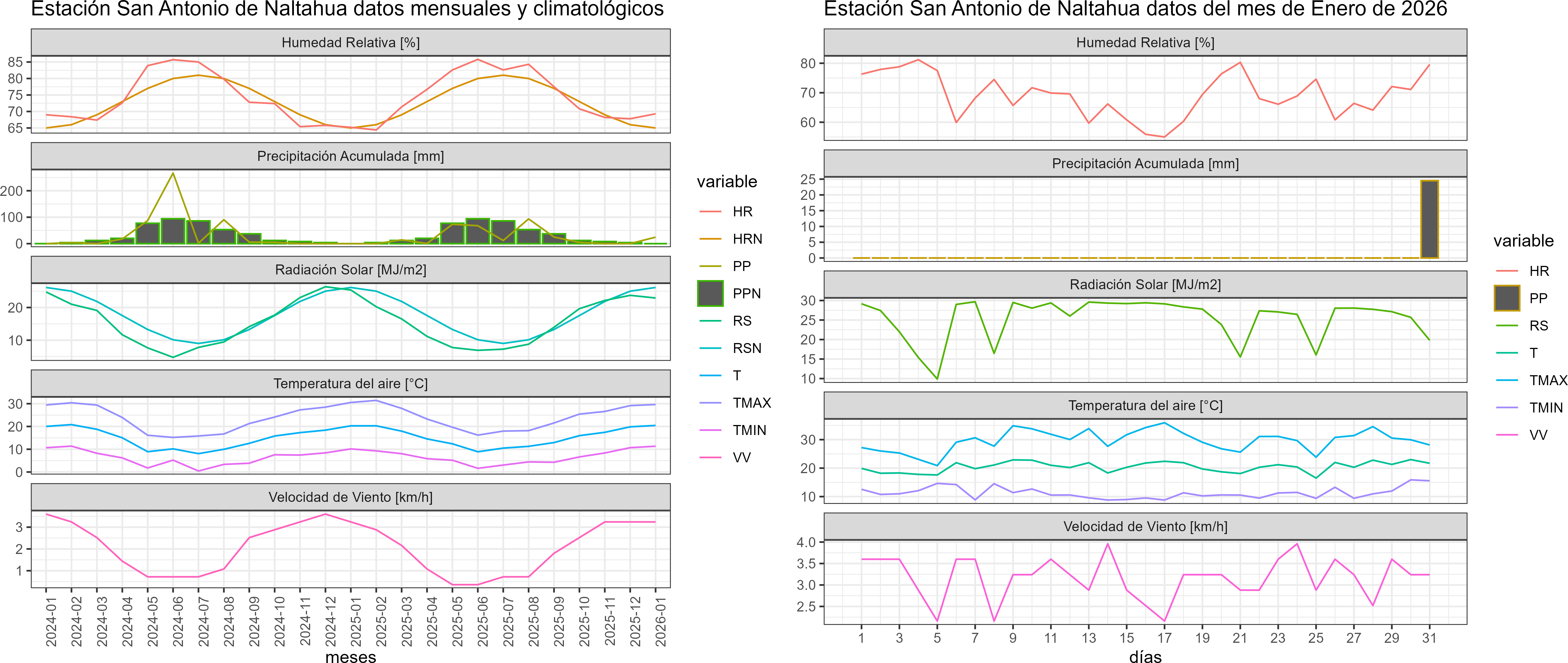 La estación San Antonio de Naltahua corresponde al distrito agroclimático 13-1. Para este distrito climático la temperatura mínima, media y máxima climatológicas alcanzan los 11°C, 21.2°C y 31.4°C respectivamente. Por su parte, respecto a las temperaturas medidas durante el mes de enero en la estación: la temperatura mínima alcanzo los 11.3°C (0.3°C sobre la climatológica), la temperatura media 20.5°C (-0.7°C bajo la climatológica) y la temperatura máxima llegó a los 29.6°C (-1.8°C bajo la climatológica). Las temperaturas extremas fueron 8,8 °C y 35,9 °C respectivamente.