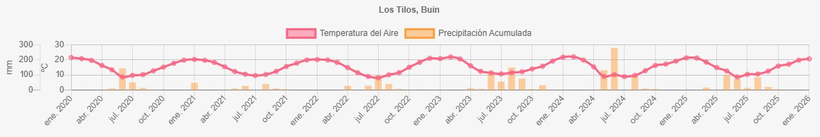 Temperaturas y precipitaciones desde 2020 a 2026 en Los tilos, Buin