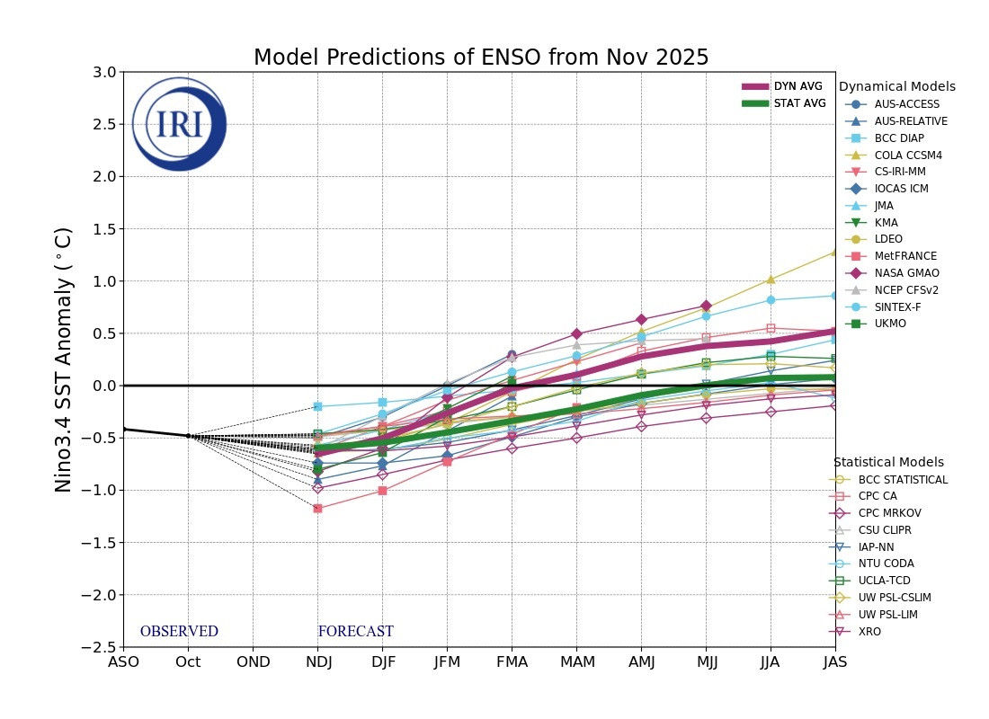 Figura 2. Evolución de Modelos de predicción del comportamiento del fenómeno ENSO representando la probabilidad de ocurrencia de La Niña en la mitad inferior del gráfico, y la de El Niño en la mitad superior del gráfico. Los registros en el rango entre -0.5 y +0.5 representan un pronóstico d condiciones neutras, y los registros sobre 0.5 indican el probable desarrollo del fenómeno del Niño.