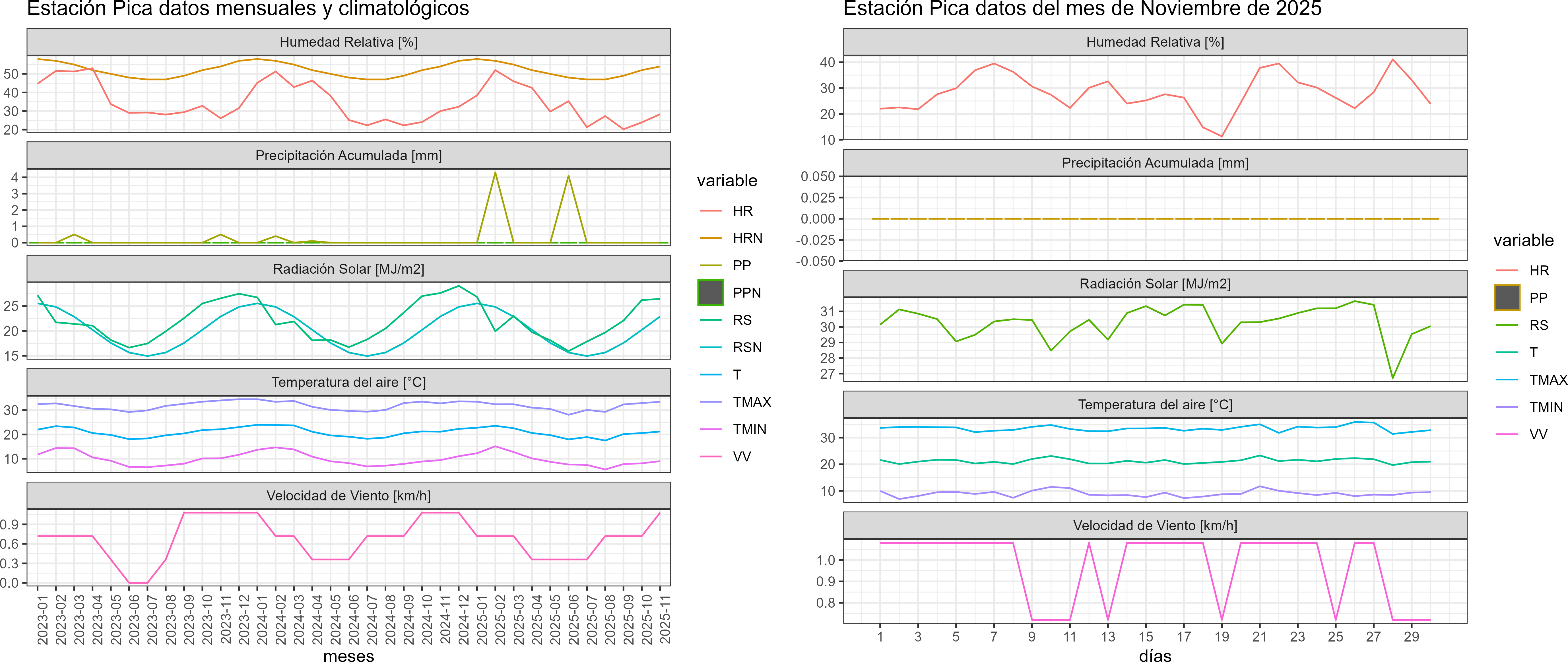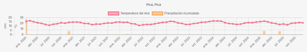 La estación Pica corresponde al distrito agroclimático 15-2-2. Para este distrito climático la temperatura mínima, media y máxima climatológicas alcanzan los 8.8°C, 20.4°C y 31.9°C respectivamente. Por su parte, respecto a las temperaturas medidas durante el mes de noviembre en la estación: la temperatura mínima alcanzo los 9°C (0.2°C sobre la climatológica), la temperatura media 21.2°C (0.8°C sobre la climatológica) y la temperatura máxima llegó a los 33.5°C (1.6°C sobre la climatológica). En el mes de noviembre se registró una pluviometría de 0 mm. De enero a noviembre se ha registrado un total acumulado de 8.4 mm, en circunstancias que un año normal registraría a la fecha 7 mm, lo que representa un superávit de 20%. A la misma fecha, durante el año 2024 la precipitación alcanzaba los 0 mm.