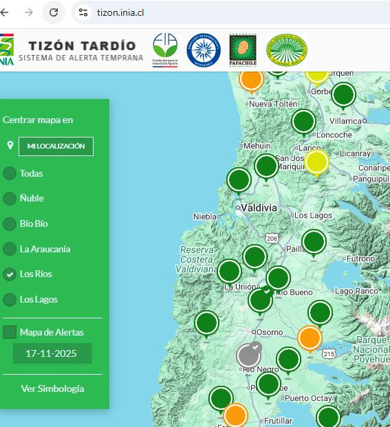 Las plantaciones del cultivo de papa ya están terminando. En la Región de Los Ríos la primavera ha sido favorable para esta labor, con condiciones ambientales cercanas a un año normal para precipitaciones y temperaturas. Estas condiciones permitieron realizar las preparaciones de suelo y las plantaciones sin inconveniente. Sin embargo, se han presentado algunos eventos de precipitaciones abundantes en poco tiempo y presencia de granizos en algunos sectores. Esta situación no causó daño importante, ya que las plantas aún están emergiendo o aún no lo hacen. En algunas plantaciones realizadas muy temprano, las plantas estaban más grandes, pero no se detectó un daño importante en las plantas. Las condiciones ambientales con alta humedad relativa y temperaturas moderadas podrían ser favorables para la presencia de tizón tardío (Phytophthora infestans) en las plantas, especialmente esta temporada, dado que quedó superficie de papa sin cosechar de la temporada pasada dado los bajos precios de las papas. Esta situación involucra un alto riesgo, ya que la presencia de papas voluntarias aumenta las fuentes de inóculo de este patógeno y de otros. Para un buen manejo preventivo de esta enfermedad se recomienda visitar la plataforma https//tizon.inia.cl, donde se puede encontrar la situación de riesgo para la presencia de tizón tardío.