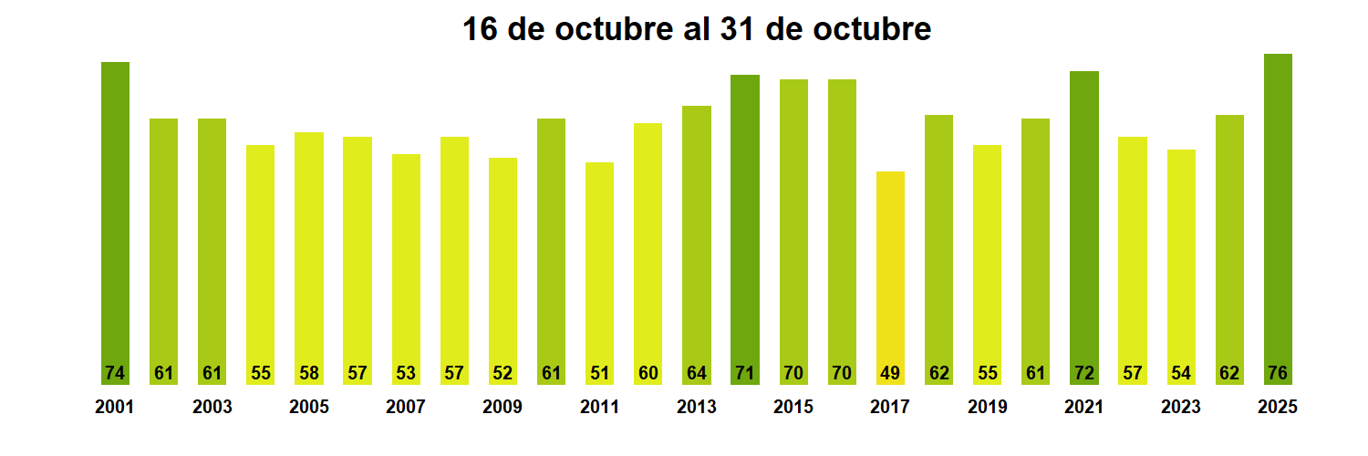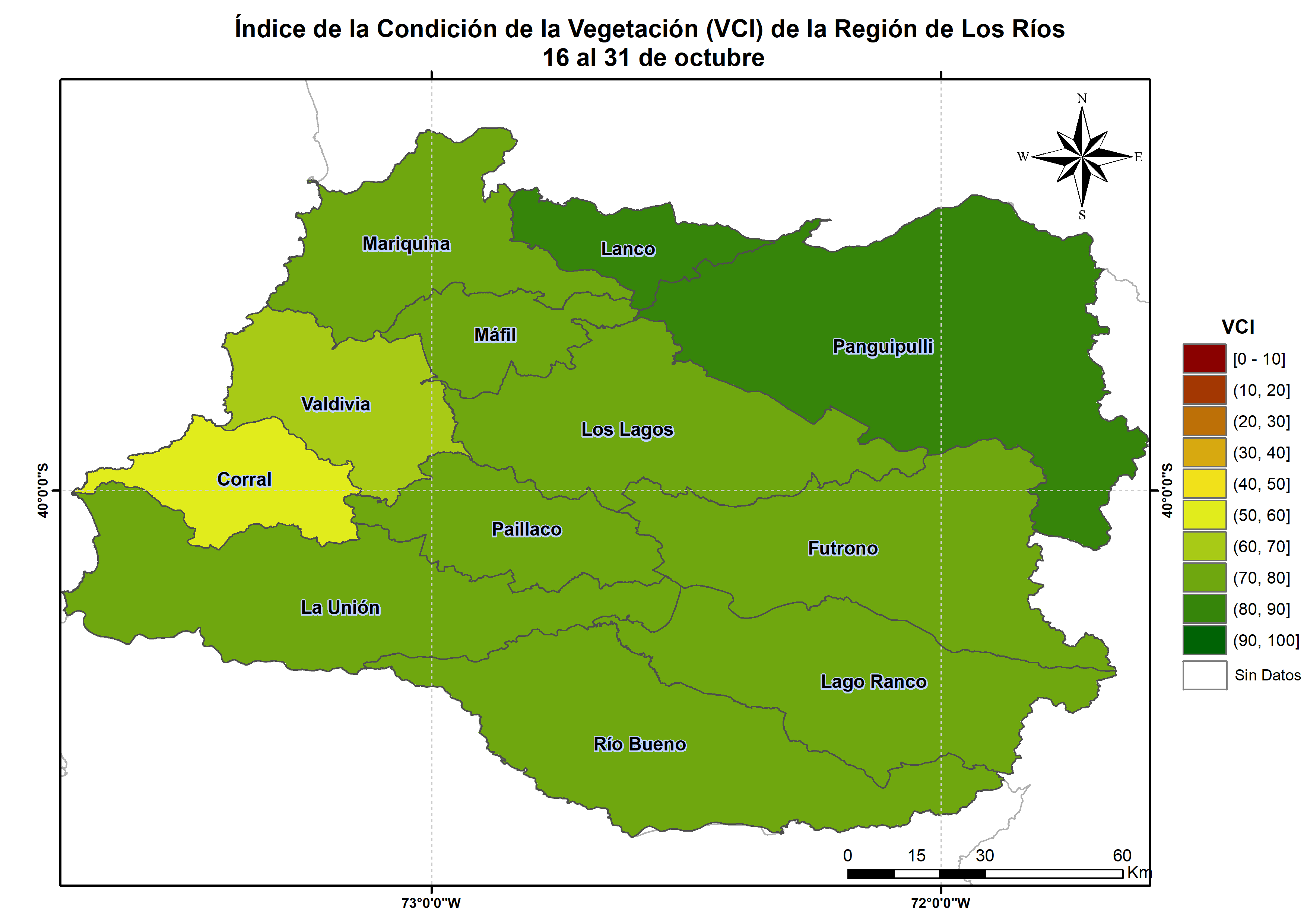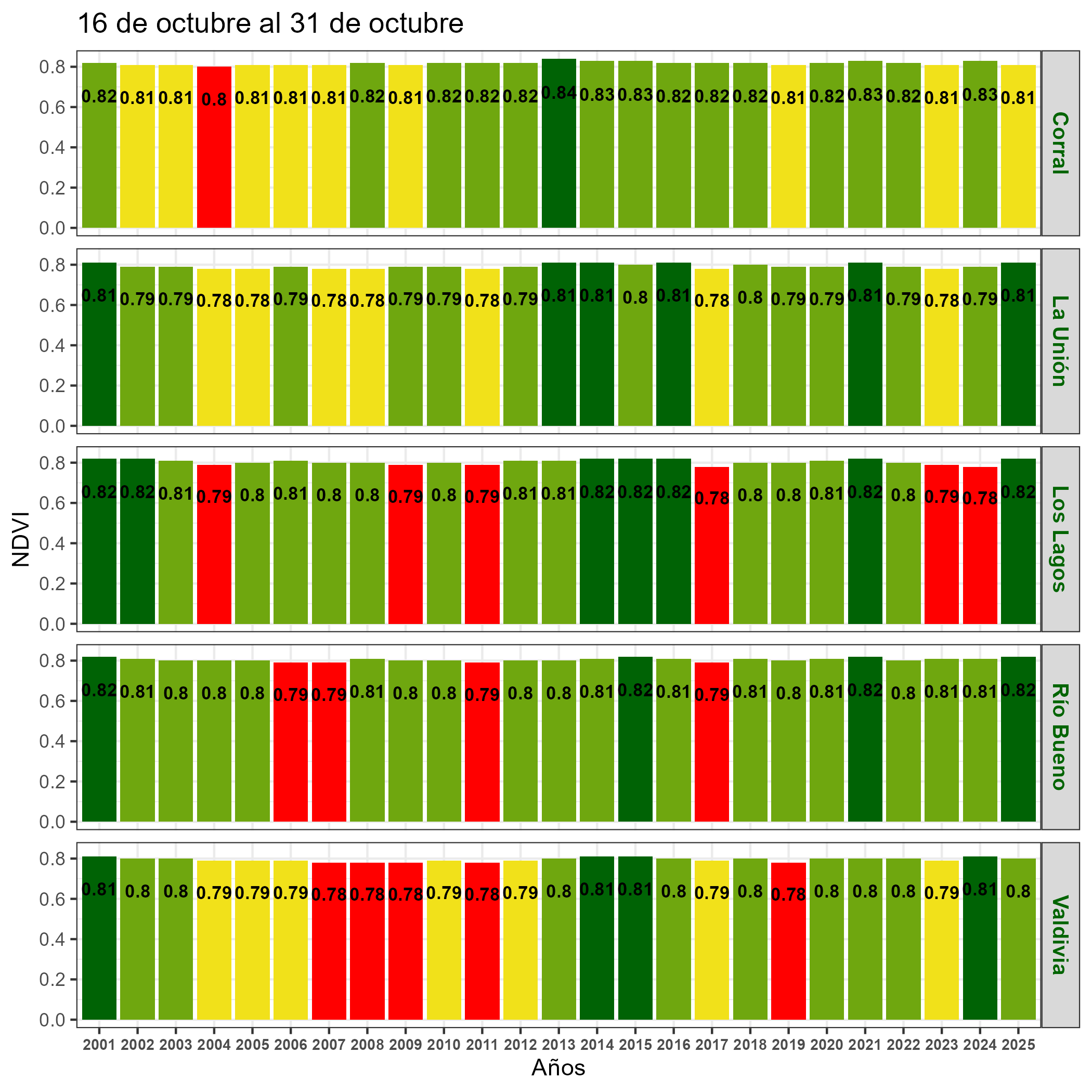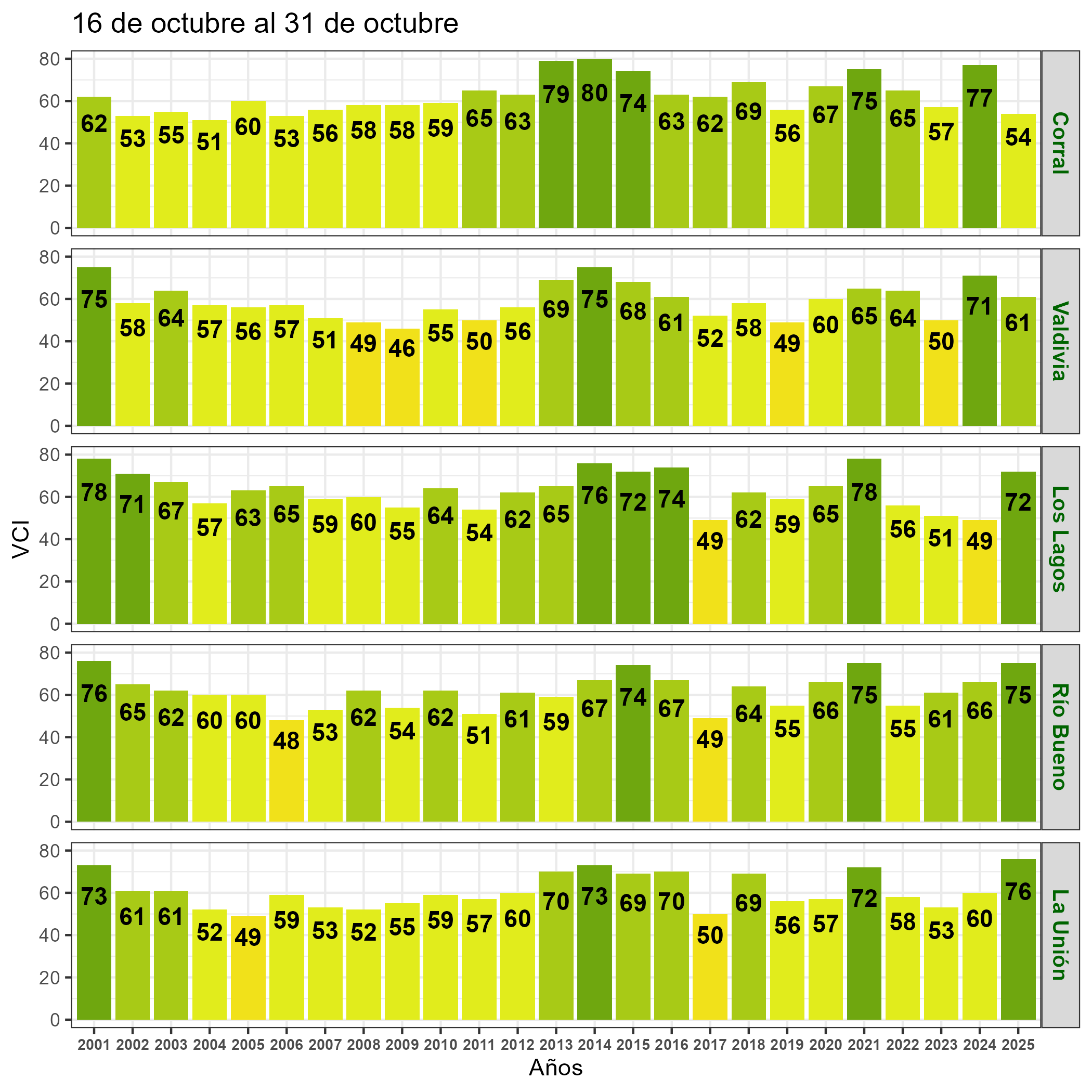 En términos globales la Región presentó un valor mediano de VCI de 76% para el período comprendido desde el 16 al 31 de octubre. A igual período del año pasado presentaba un VCI de 62% (Fig. 1). De acuerdo a la Tabla 1 la Región de Los Rios, en términos globales presenta una condición Favorable.