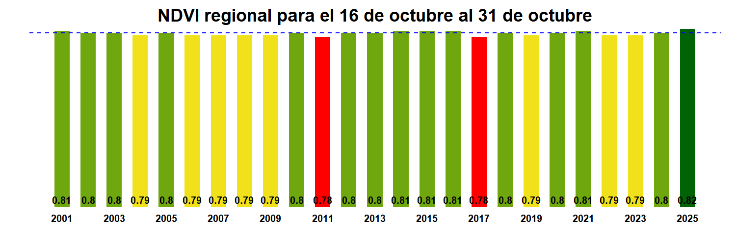 Para esta quincena se observa un NDVI promedio regional de 0.82 mientras el año pasado había sido de 0.8. El valor promedio histórico para esta región, en este período del año es de 0.8.