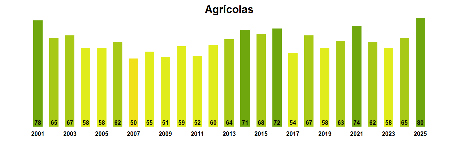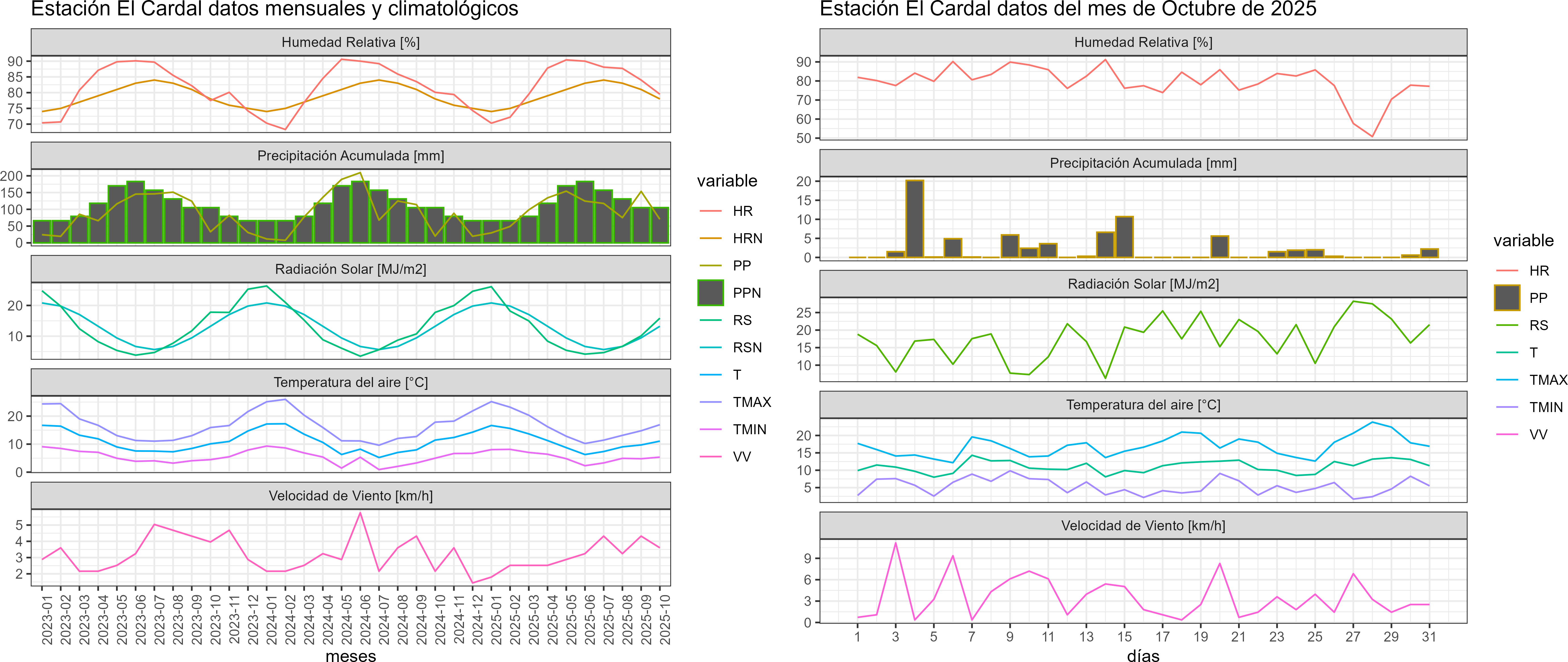 La estación El Cardal corresponde al distrito agroclimático 14-10-2. Para este distrito climático la temperatura mínima, media y máxima climatológicas alcanzan los 5.5°C, 11.2°C y 16.9°C respectivamente. Por su parte, respecto a las temperaturas medidas durante el mes de octubre en la estación: la temperatura mínima alcanzo los 5.4°C (-0.1°C bajo la climatológica), la temperatura media 11.1°C (-0.1°C bajo la climatológica) y la temperatura máxima llegó a los 16.9°C (Igual la climatológico). En el mes de octubre se registró una pluviometría de 70.4 mm, lo cual representa un 77.4% con respecto al mismo mes de un año normal. De enero a octubre se ha registrado un total acumulado de 1006.8 mm, en circunstancias que un año normal registraría a la fecha 1196 mm, lo que representa un déficit de 15.8%. A la misma fecha, durante el año 2024 la precipitación alcanzaba los 20 mm.