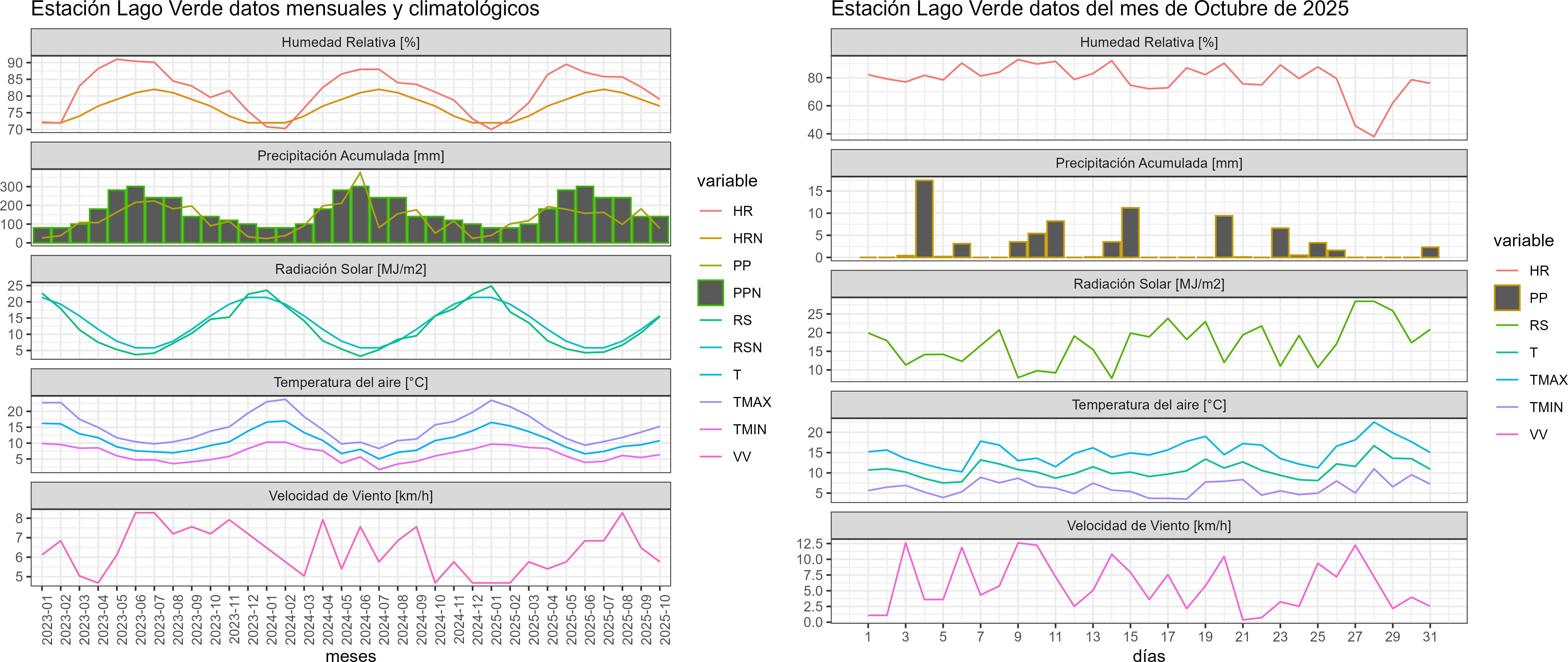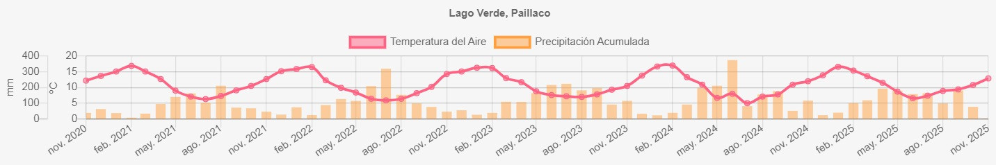 La estación Lago Verde corresponde al distrito agroclimático 9-14-2. Para este distrito climático la temperatura mínima, media y máxima climatológicas alcanzan los 5.4°C, 10.7°C y 15.9°C respectivamente. Por su parte, respecto a las temperaturas medidas durante el mes de octubre en la estación: la temperatura mínima alcanzo los 6.4°C (1°C sobre la climatológica), la temperatura media 10.8°C (0.1°C sobre la climatológica) y la temperatura máxima llegó a los 15.2°C (-0.7°C bajo la climatológica). En el mes de octubre se registró una pluviometría de 76.8 mm, lo cual representa un 60.5% con respecto al mismo mes de un año normal. De enero a octubre se ha registrado un total acumulado de 1308.3 mm, en circunstancias que un año normal registraría a la fecha 1606 mm, lo que representa un déficit de 18.5%. A la misma fecha, durante el año 2024 la precipitación alcanzaba los 51.3 mm.