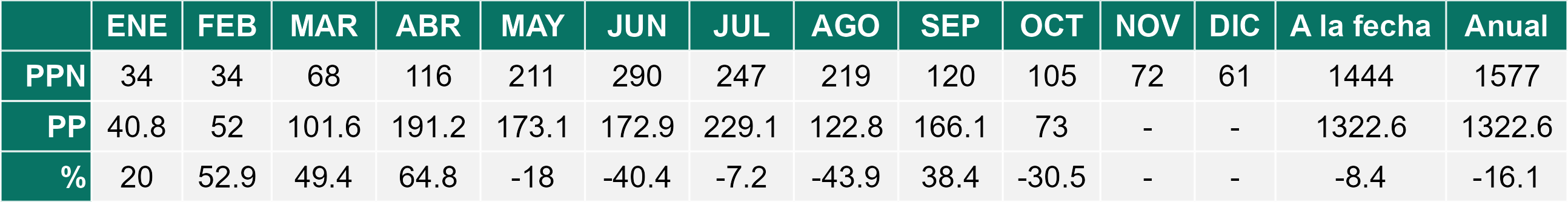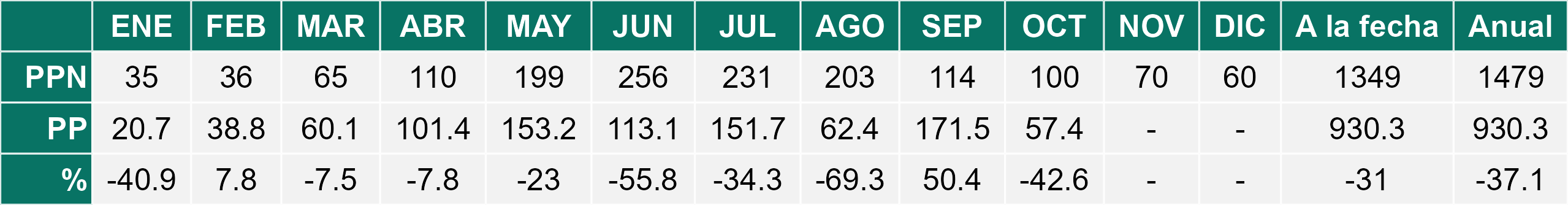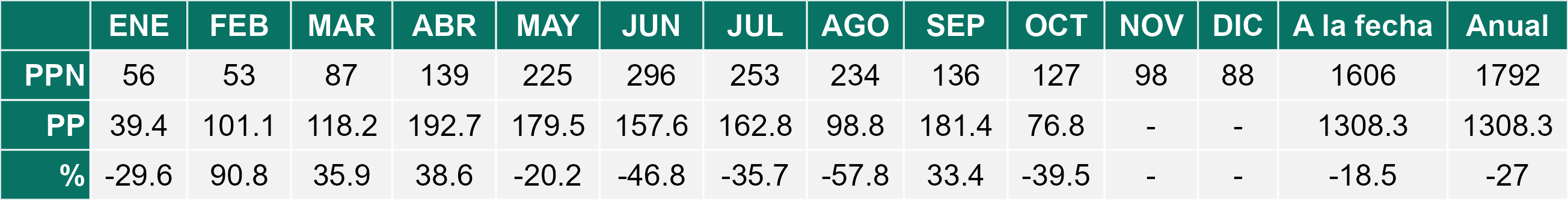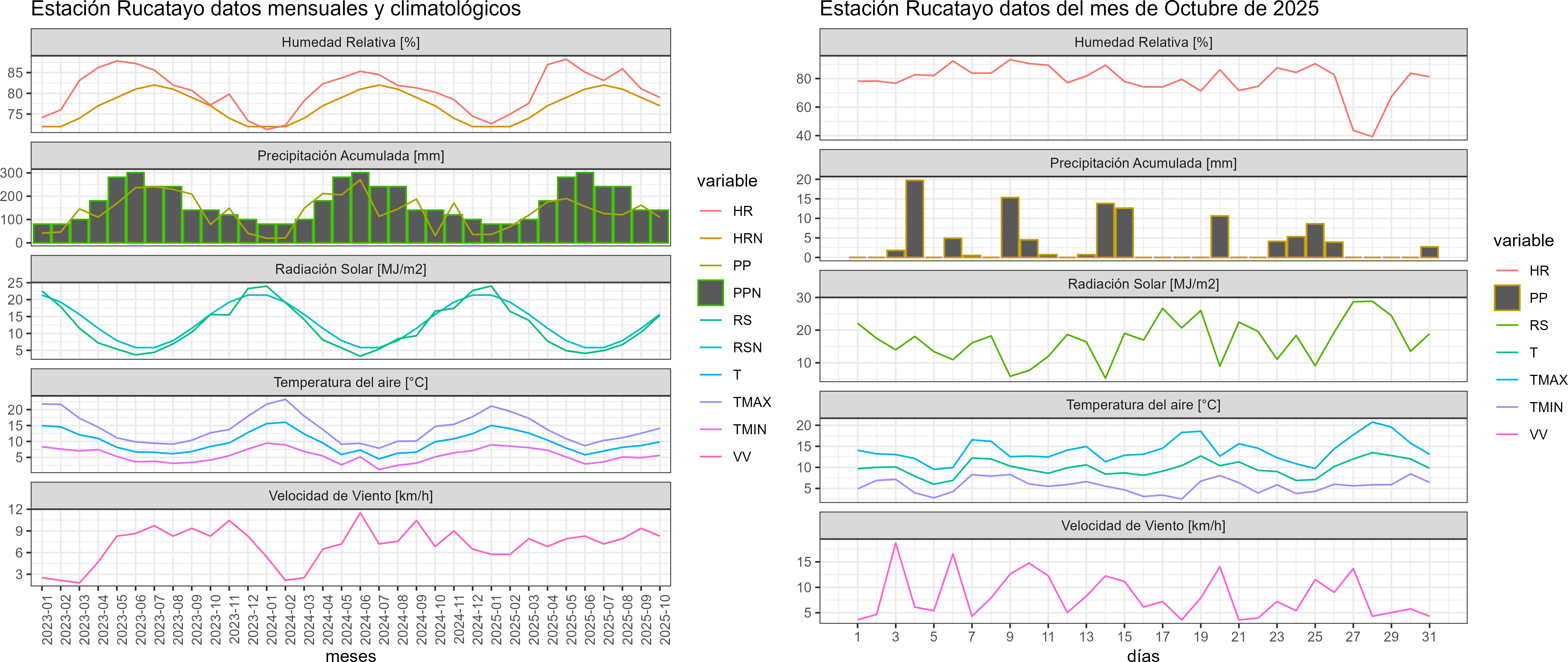 La estación Rucatayo corresponde al distrito agroclimático 9-14-2. Para este distrito climático la temperatura mínima, media y máxima climatológicas alcanzan los 5.2°C, 10.2°C y 15.2°C respectivamente. Por su parte, respecto a las temperaturas medidas durante el mes de octubre en la estación: la temperatura mínima alcanzo los 5.6°C (0.4°C sobre la climatológica), la temperatura media 9.8°C (-0.4°C bajo la climatológica) y la temperatura máxima llegó a los 14.1°C (-1.1°C bajo la climatológica). En el mes de octubre se registró una pluviometría de 109.7 mm, lo cual representa un 72.6% con respecto al mismo mes de un año normal. De enero a octubre se ha registrado un total acumulado de 1262.3 mm, en circunstancias que un año normal registraría a la fecha 1913 mm, lo que representa un déficit de 34%. A la misma fecha, durante el año 2024 la precipitación alcanzaba los 30.6 mm.