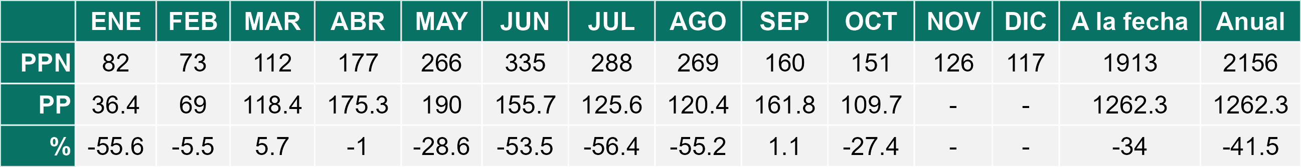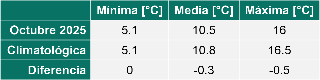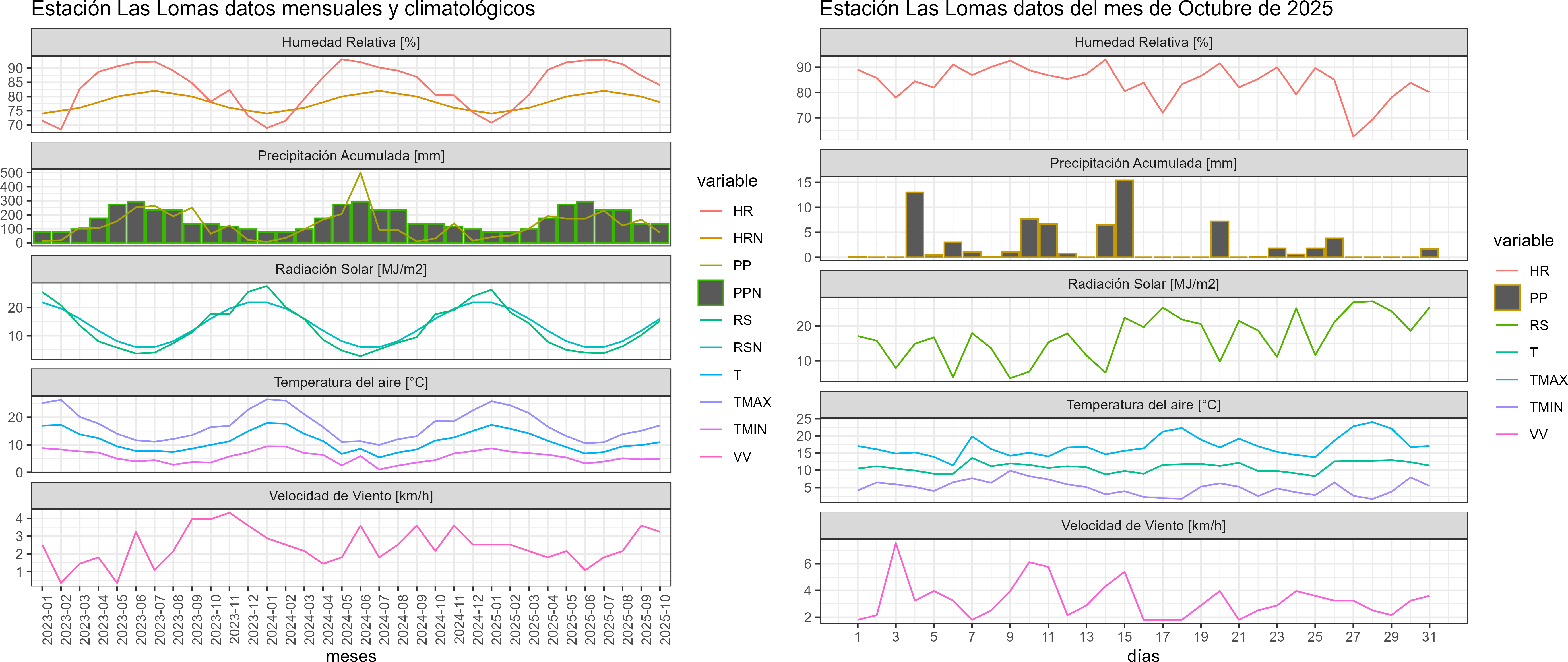 La estación Las Lomas corresponde al distrito agroclimático 9-14-1. Para este distrito climático la temperatura mínima, media y máxima climatológicas alcanzan los 5.5°C, 11.2°C y 16.9°C respectivamente. Por su parte, respecto a las temperaturas medidas durante el mes de octubre en la estación: la temperatura mínima alcanzo los 5°C (-0.5°C bajo la climatológica), la temperatura media 11°C (-0.2°C bajo la climatológica) y la temperatura máxima llegó a los 17°C (0.1°C sobre la climatológica). En el mes de octubre se registró una pluviometría de 73 mm, lo cual representa un 69.5% con respecto al mismo mes de un año normal. De enero a octubre se ha registrado un total acumulado de 1322.6 mm, en circunstancias que un año normal registraría a la fecha 1444 mm, lo que representa un déficit de 8.4%. A la misma fecha, durante el año 2024 la precipitación alcanzaba los 31 mm.