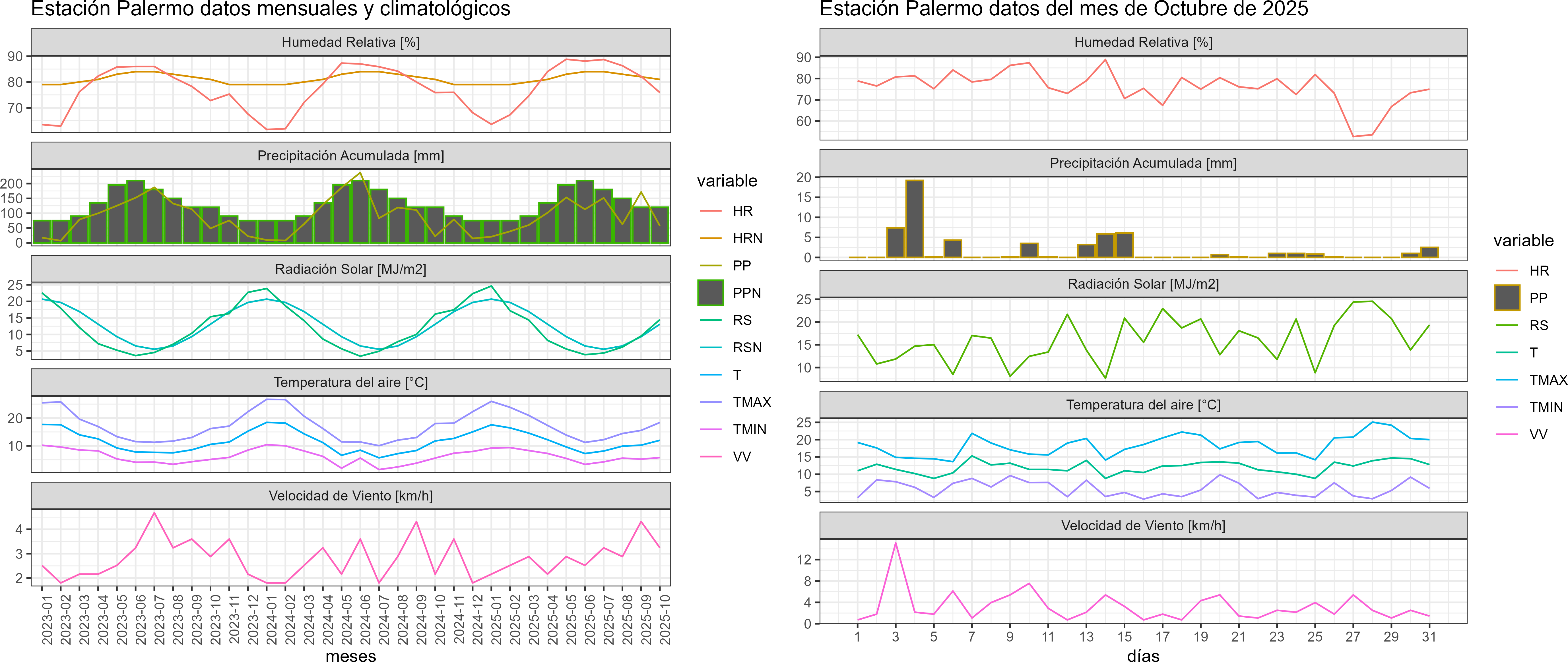 La estación Palermo corresponde al distrito agroclimático 14-10-1. Para este distrito climático la temperatura mínima, media y máxima climatológicas alcanzan los 5.2°C, 11°C y 16.7°C respectivamente. Por su parte, respecto a las temperaturas medidas durante el mes de octubre en la estación: la temperatura mínima alcanzo los 5.8°C (0.6°C sobre la climatológica), la temperatura media 12°C (1°C sobre la climatológica) y la temperatura máxima llegó a los 18.4°C (1.7°C sobre la climatológica). En el mes de octubre se registró una pluviometría de 57.4 mm, lo cual representa un 57.4% con respecto al mismo mes de un año normal. De enero a octubre se ha registrado un total acumulado de 930.3 mm, en circunstancias que un año normal registraría a la fecha 1349 mm, lo que representa un déficit de 31%. A la misma fecha, durante el año 2024 la precipitación alcanzaba los 22.1 mm.