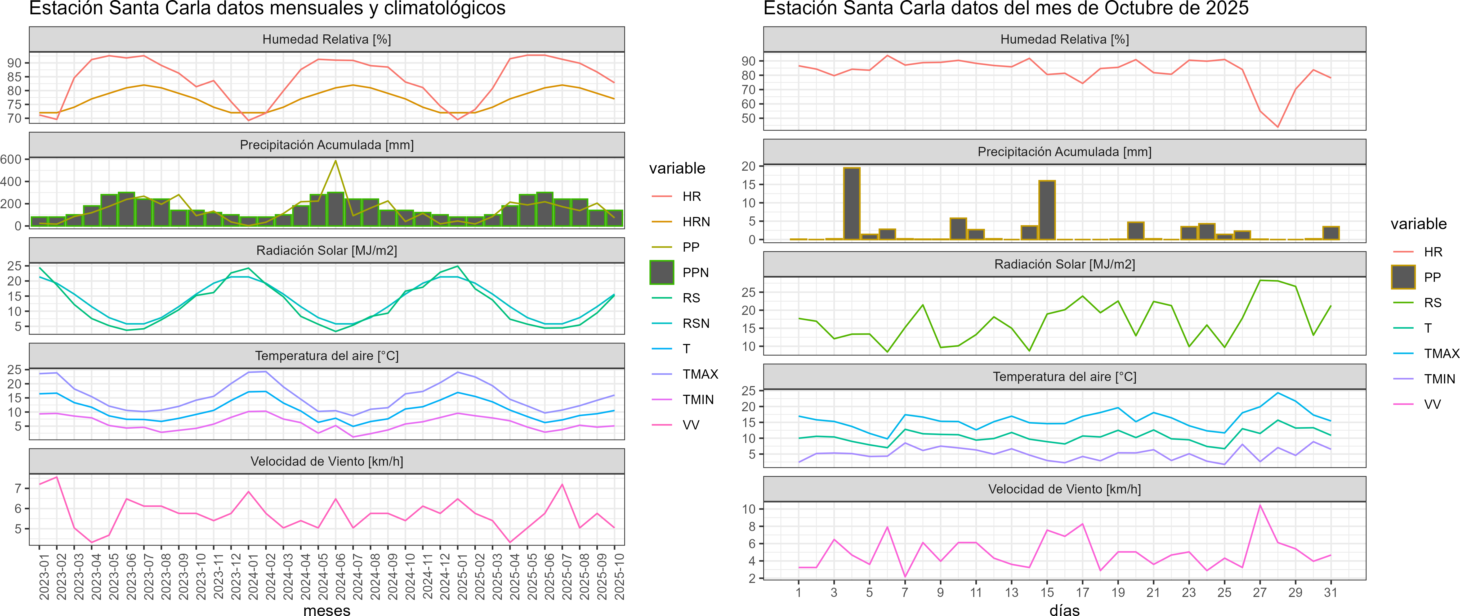 La estación Santa Carla corresponde al distrito agroclimático 9-14-2. Para este distrito climático la temperatura mínima, media y máxima climatológicas alcanzan los 5.1°C, 10.8°C y 16.5°C respectivamente. Por su parte, respecto a las temperaturas medidas durante el mes de octubre en la estación: la temperatura mínima alcanzo los 5.1°C (Igual al valor climatológico), la temperatura media 10.5°C (-0.3°C bajo la climatológica) y la temperatura máxima llegó a los 16°C (-0.5°C bajo la climatológica). En el mes de octubre se registró una pluviometría de 73.1 mm, lo cual representa un 55% con respecto al mismo mes de un año normal. De enero a octubre se ha registrado un total acumulado de 1359.6 mm, en circunstancias que un año normal registraría a la fecha 1712 mm, lo que representa un déficit de 20.6%. A la misma fecha, durante el año 2024 la precipitación alcanzaba los 40 mm.