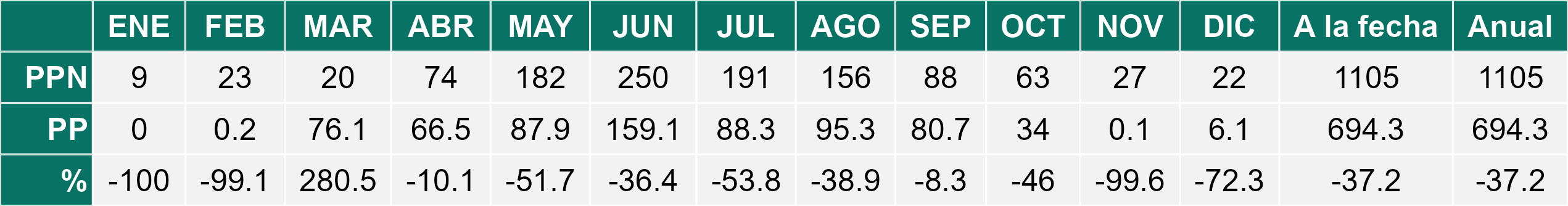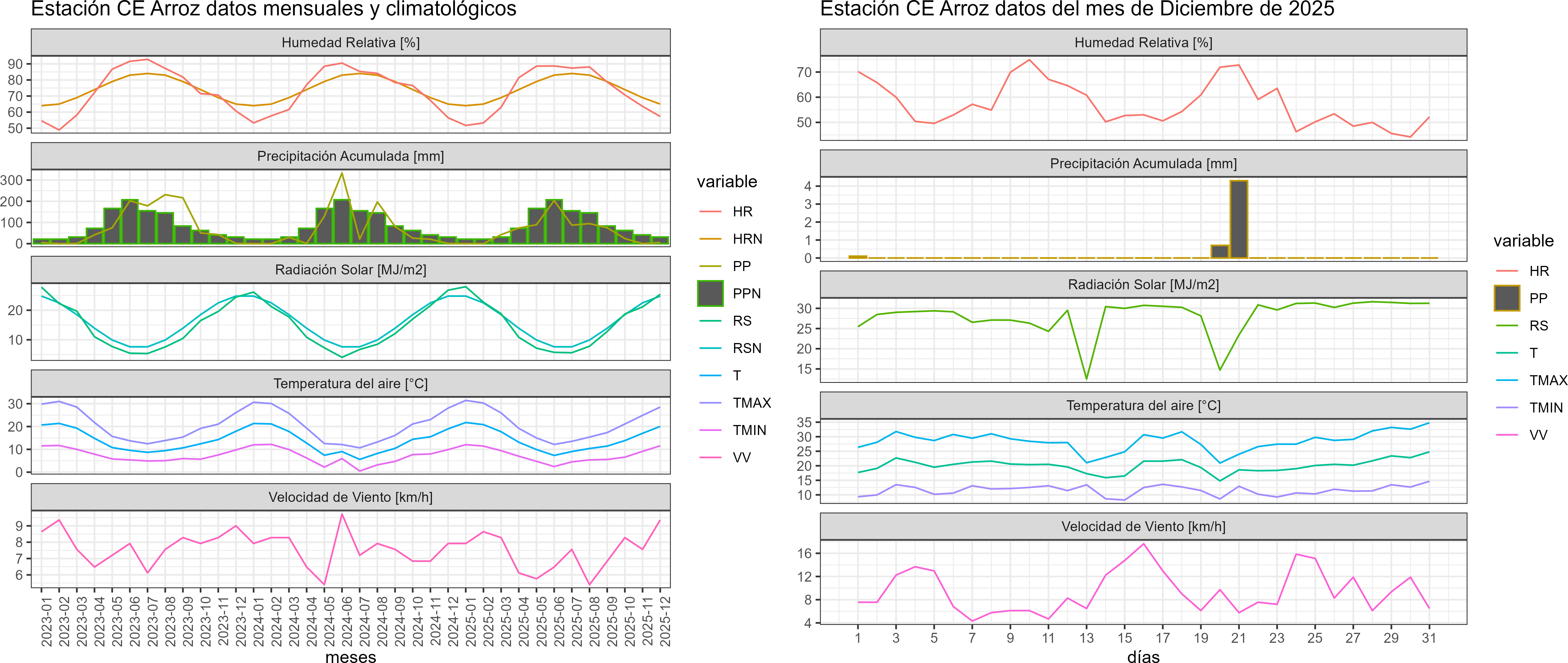 La estación CE Arroz corresponde al distrito agroclimático 7-9-1. Para este distrito climático la temperatura mínima, media y máxima climatológicas alcanzan los 9.4°C, 18.8°C y 28.2°C respectivamente. Por su parte, respecto a las temperaturas medidas durante el mes de diciembre en la estación: la temperatura mínima alcanzo los 11.6°C (2.2°C sobre la climatológica), la temperatura media 20.1°C (1.3°C sobre la climatológica) y la temperatura máxima llegó a los 28.5°C (0.3°C sobre la climatológica). En el mes de diciembre se registró una pluviometría de 5.1 mm, lo cual representa un 31.9% con respecto al mismo mes de un año normal. De enero a diciembre se ha registrado un total acumulado de 694.7 mm, en circunstancias que un año normal registraría a la fecha 950 mm, lo que representa un déficit de 26.9%. A la misma fecha, durante el año 2024 la precipitación alcanzaba los 1 mm.