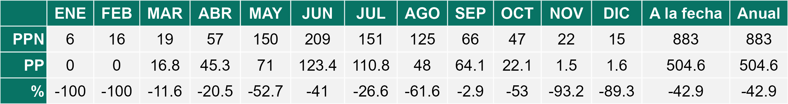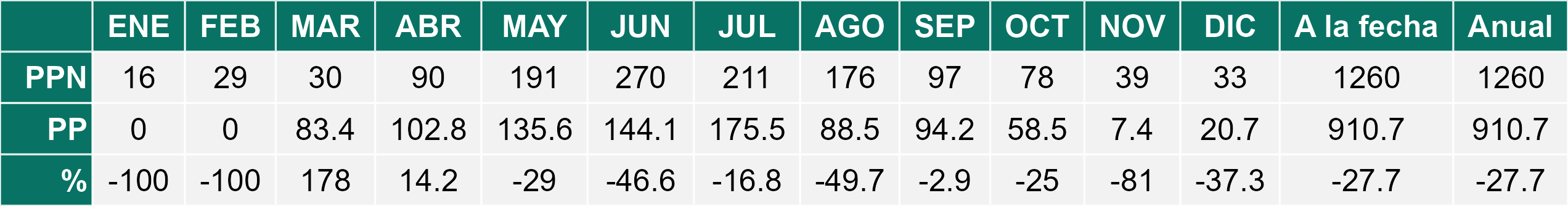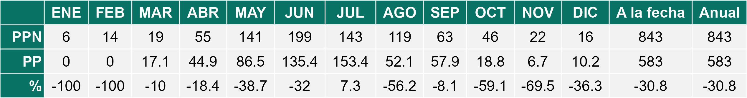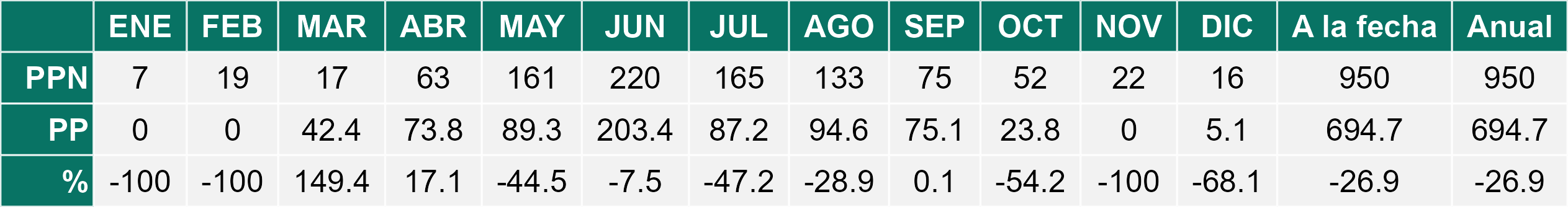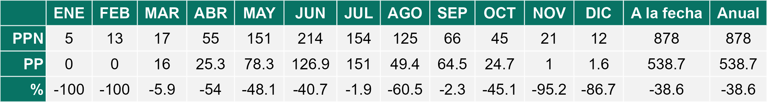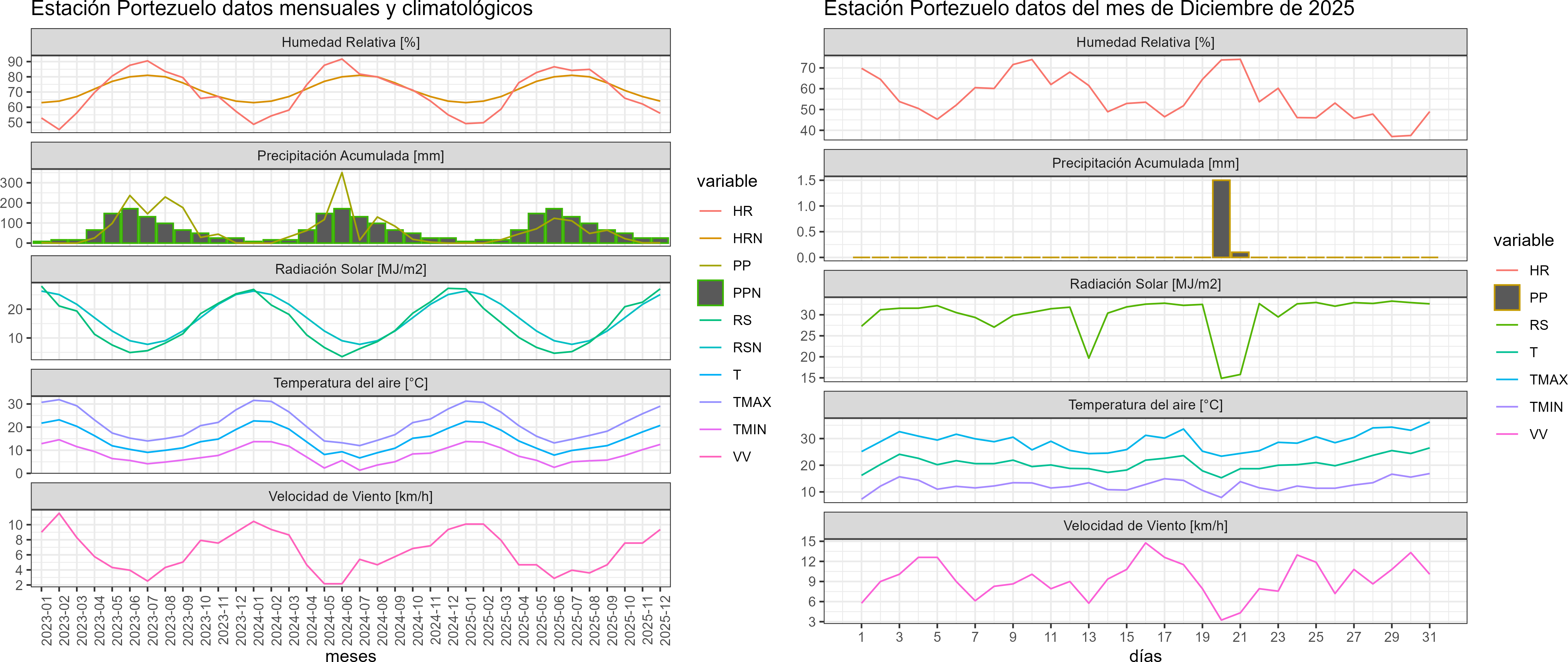 La estación Portezuelo corresponde al distrito agroclimático 7-8-3. Para este distrito climático la temperatura mínima, media y máxima climatológicas alcanzan los 10.5°C, 18.9°C y 27.3°C respectivamente. Por su parte, respecto a las temperaturas medidas durante el mes de diciembre en la estación: la temperatura mínima alcanzo los 12.5°C (2°C sobre la climatológica), la temperatura media 20.7°C (1.8°C sobre la climatológica) y la temperatura máxima llegó a los 29°C (1.7°C sobre la climatológica). En el mes de diciembre se registró una pluviometría de 1.6 mm, lo cual representa un 10.7% con respecto al mismo mes de un año normal. De enero a diciembre se ha registrado un total acumulado de 504.6 mm, en circunstancias que un año normal registraría a la fecha 883 mm, lo que representa un déficit de 42.9%. A la misma fecha, durante el año 2024 la precipitación alcanzaba los 0 mm.