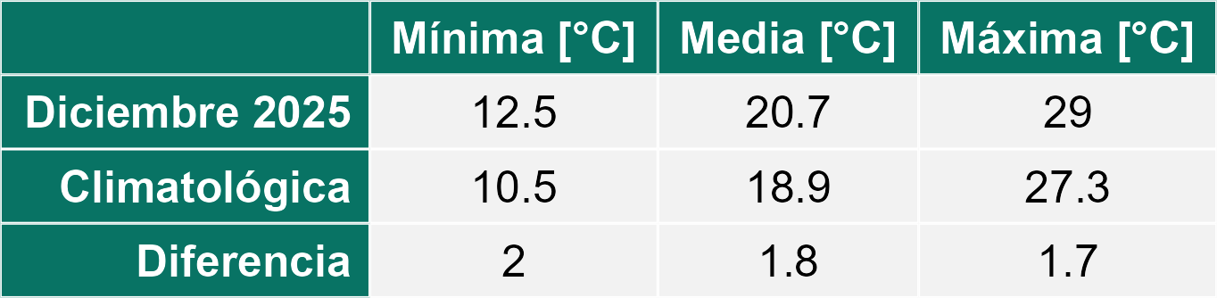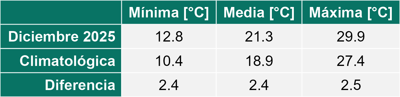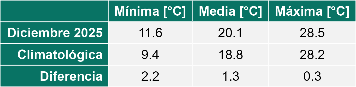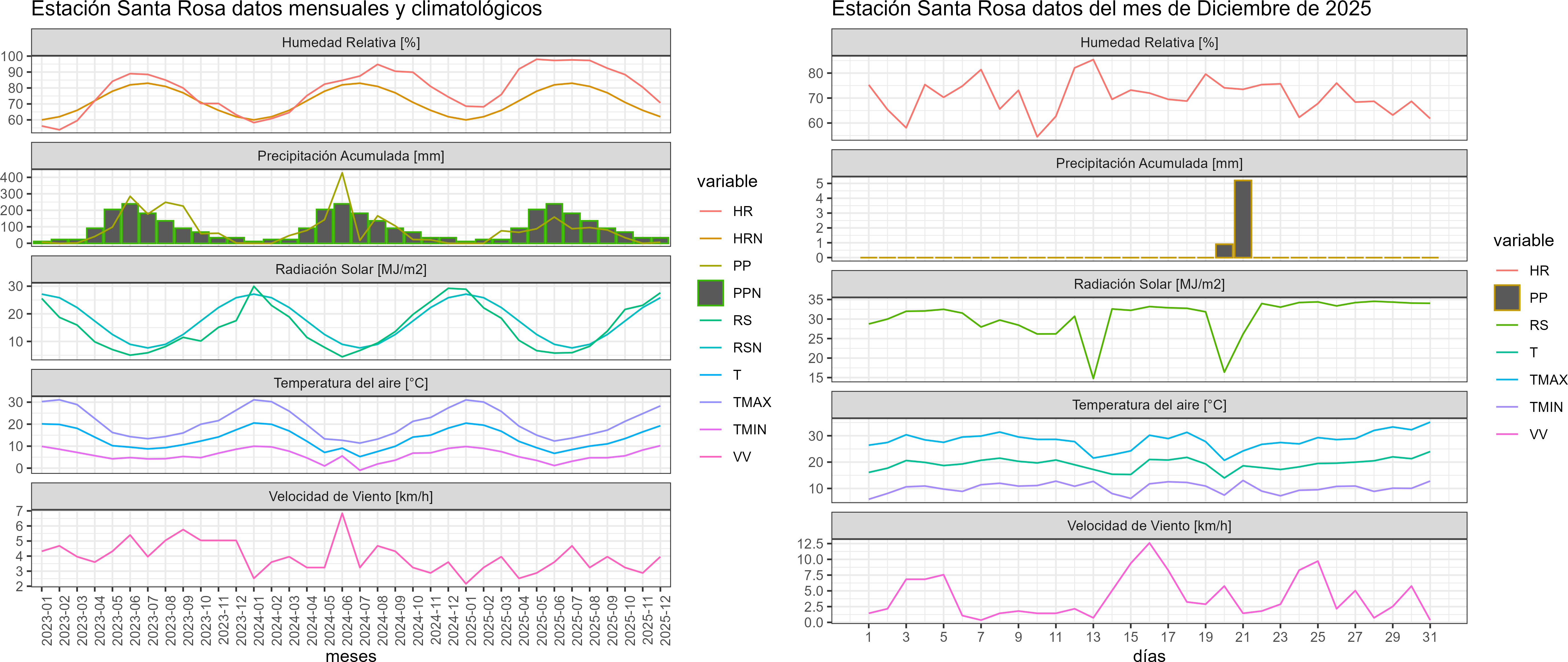 La estación Santa Rosa corresponde al distrito agroclimático 7-8-5. Para este distrito climático la temperatura mínima, media y máxima climatológicas alcanzan los 8.9°C, 18.2°C y 27.4°C respectivamente. Por su parte, respecto a las temperaturas medidas durante el mes de diciembre en la estación: la temperatura mínima alcanzo los 10.2°C (1.3°C sobre la climatológica), la temperatura media 19.3°C (1.1°C sobre la climatológica) y la temperatura máxima llegó a los 28.3°C (0.9°C sobre la climatológica). En el mes de diciembre se registró una pluviometría de 6.1 mm, lo cual representa un 27.7% con respecto al mismo mes de un año normal. De enero a diciembre se ha registrado un total acumulado de 694.3 mm, en circunstancias que un año normal registraría a la fecha 1105 mm, lo que representa un déficit de 37.2%. A la misma fecha, durante el año 2024 la precipitación alcanzaba los 0.6 mm.