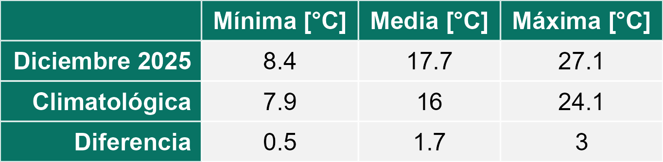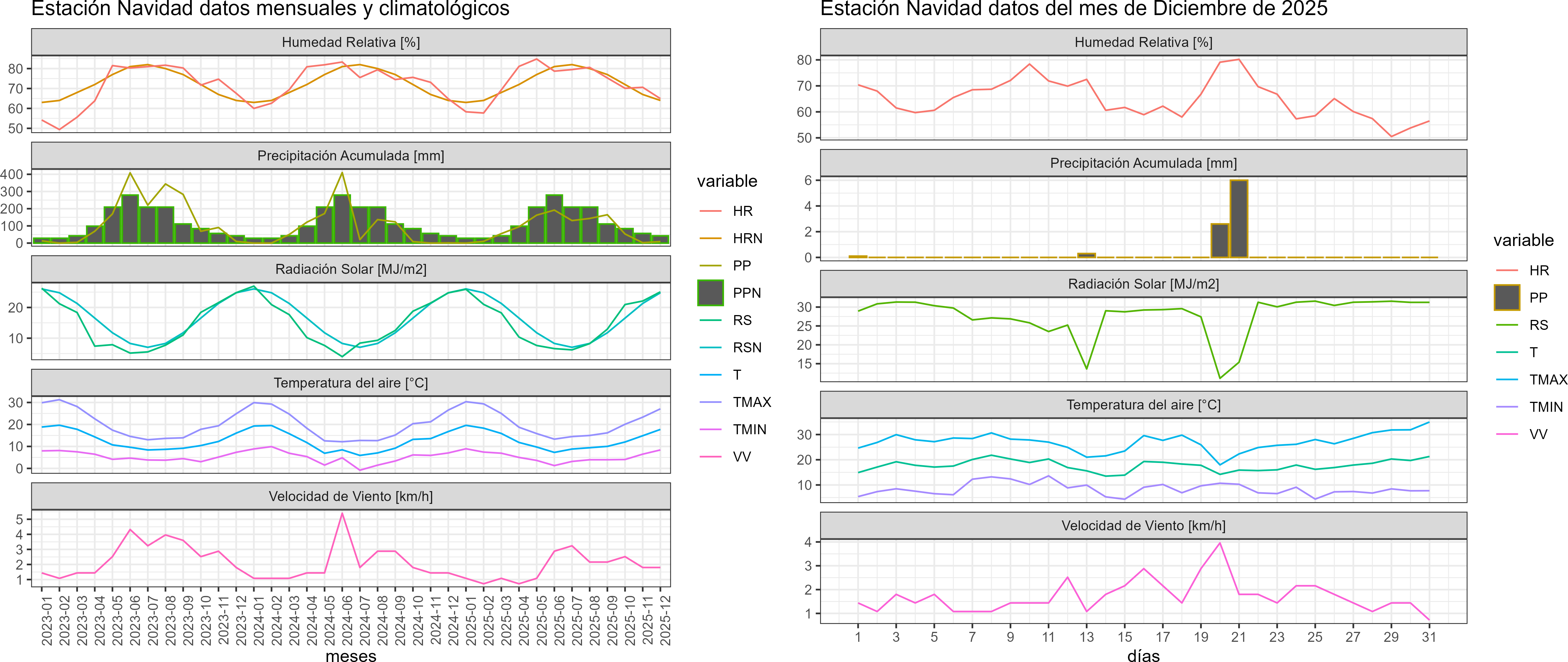 La estación Navidad corresponde al distrito agroclimático 6-8-1. Para este distrito climático la temperatura mínima, media y máxima climatológicas alcanzan los 7.9°C, 16°C y 24.1°C respectivamente. Por su parte, respecto a las temperaturas medidas durante el mes de diciembre en la estación: la temperatura mínima alcanzo los 8.4°C (0.5°C sobre la climatológica), la temperatura media 17.7°C (1.7°C sobre la climatológica) y la temperatura máxima llegó a los 27.1°C (3°C sobre la climatológica). En el mes de diciembre se registró una pluviometría de 9 mm, lo cual representa un 20.9% con respecto al mismo mes de un año normal. De enero a diciembre se ha registrado un total acumulado de 1017.3 mm, en circunstancias que un año normal registraría a la fecha 1597 mm, lo que representa un déficit de 36.3%. A la misma fecha, durante el año 2024 la precipitación alcanzaba los 1.4 mm.