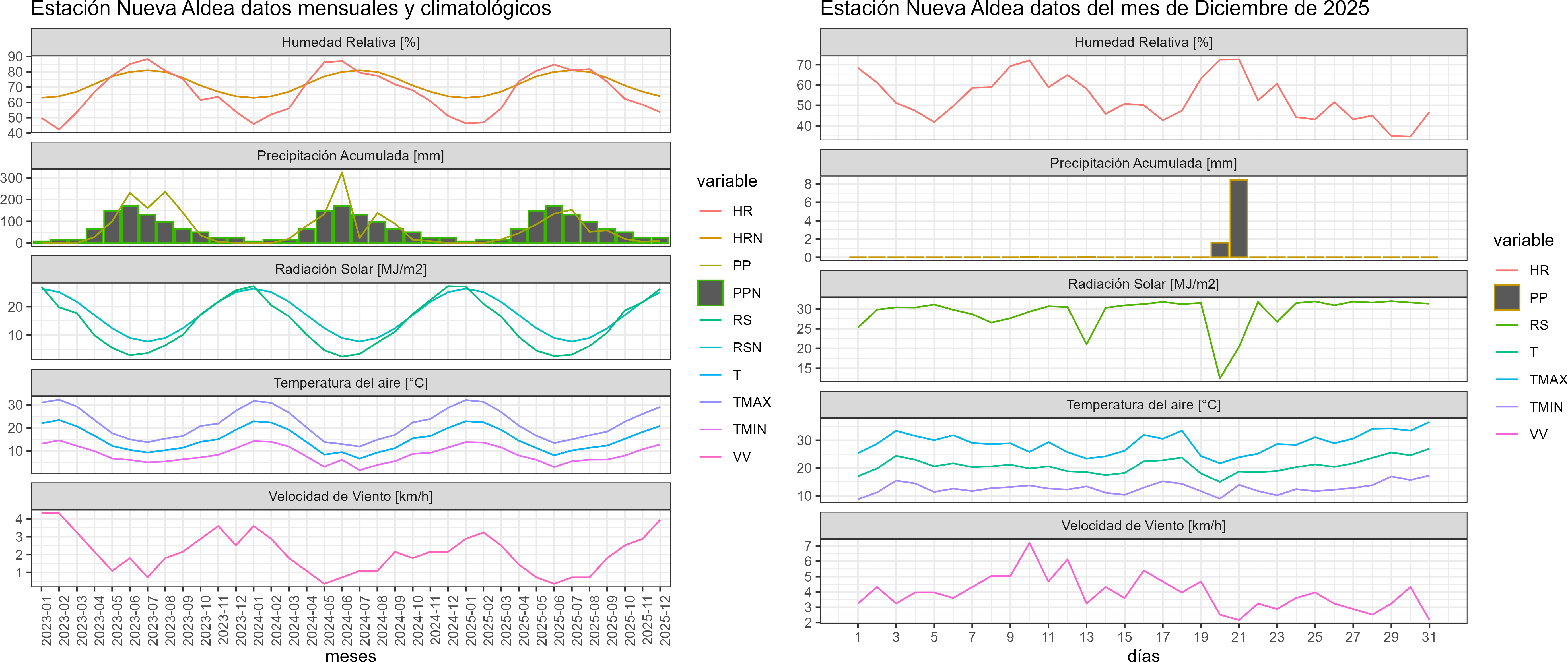 La estación Nueva Aldea corresponde al distrito agroclimático 7-8-3. Para este distrito climático la temperatura mínima, media y máxima climatológicas alcanzan los 9.9°C, 18.5°C y 27.2°C respectivamente. Por su parte, respecto a las temperaturas medidas durante el mes de diciembre en la estación: la temperatura mínima alcanzo los 12.8°C (2.9°C sobre la climatológica), la temperatura media 20.8°C (2.3°C sobre la climatológica) y la temperatura máxima llegó a los 29°C (1.8°C sobre la climatológica). En el mes de diciembre se registró una pluviometría de 10.2 mm, lo cual representa un 63.7% con respecto al mismo mes de un año normal. De enero a diciembre se ha registrado un total acumulado de 583 mm, en circunstancias que un año normal registraría a la fecha 843 mm, lo que representa un déficit de 30.8%. A la misma fecha, durante el año 2024 la precipitación alcanzaba los 0 mm.