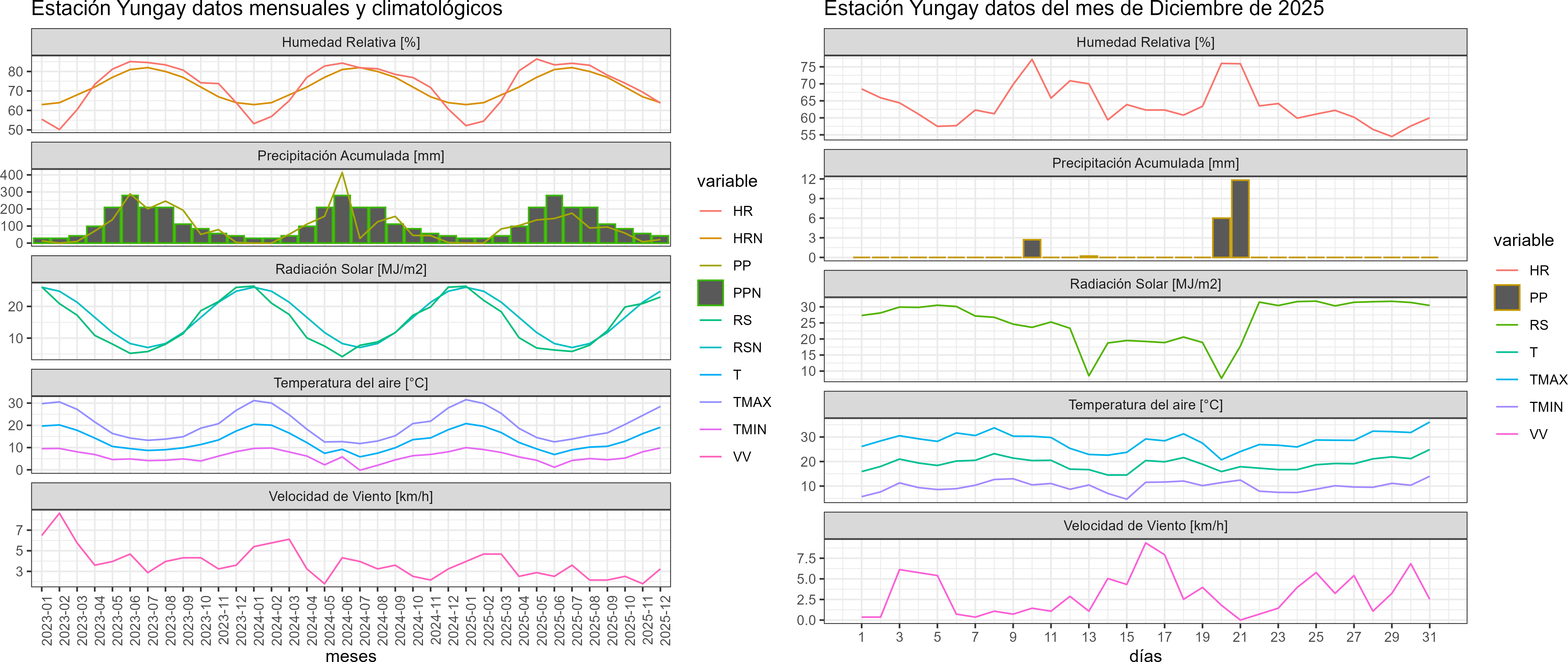 La estación Yungay corresponde al distrito agroclimático 6-8-1. Para este distrito climático la temperatura mínima, media y máxima climatológicas alcanzan los 9.1°C, 17.4°C y 25.7°C respectivamente. Por su parte, respecto a las temperaturas medidas durante el mes de diciembre en la estación: la temperatura mínima alcanzo los 9.8°C (0.7°C sobre la climatológica), la temperatura media 19.1°C (1.7°C sobre la climatológica) y la temperatura máxima llegó a los 28.5°C (2.8°C sobre la climatológica). En el mes de diciembre se registró una pluviometría de 20.7 mm, lo cual representa un 62.7% con respecto al mismo mes de un año normal. De enero a diciembre se ha registrado un total acumulado de 910.7 mm, en circunstancias que un año normal registraría a la fecha 1260 mm, lo que representa un déficit de 27.7%. A la misma fecha, durante el año 2024 la precipitación alcanzaba los 3.4 mm.