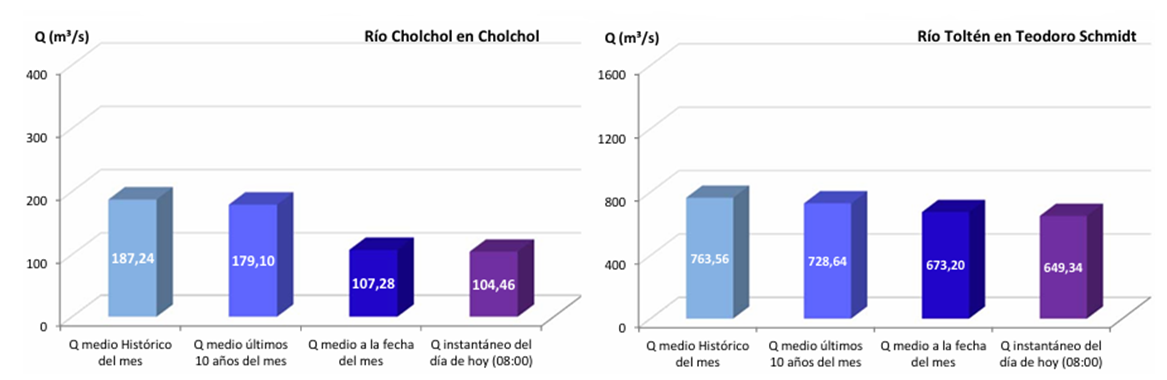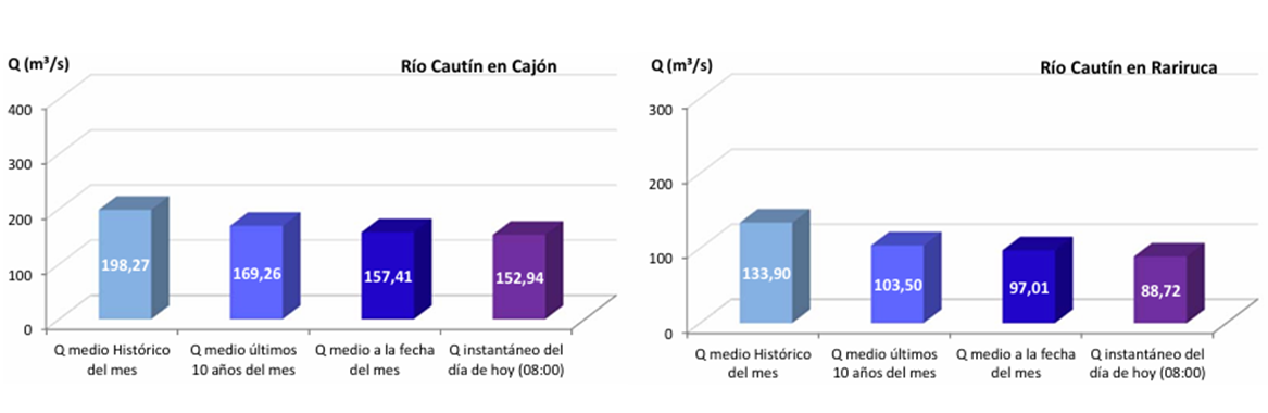 En la misma fecha, el caudal (Q) en el río Cautín, en la localidad de Rariruca, fue de 97,01 m³/s. Históricamente, este valor es inferior al registrado en Cajón (157,41 m³/s). Este mes, la cifra de caudal retrocede respecto al mes anterior (156,91 m³/s) y al promedio de los últimos 10 años para la estación de Rariruca (103,50 m³/s).
