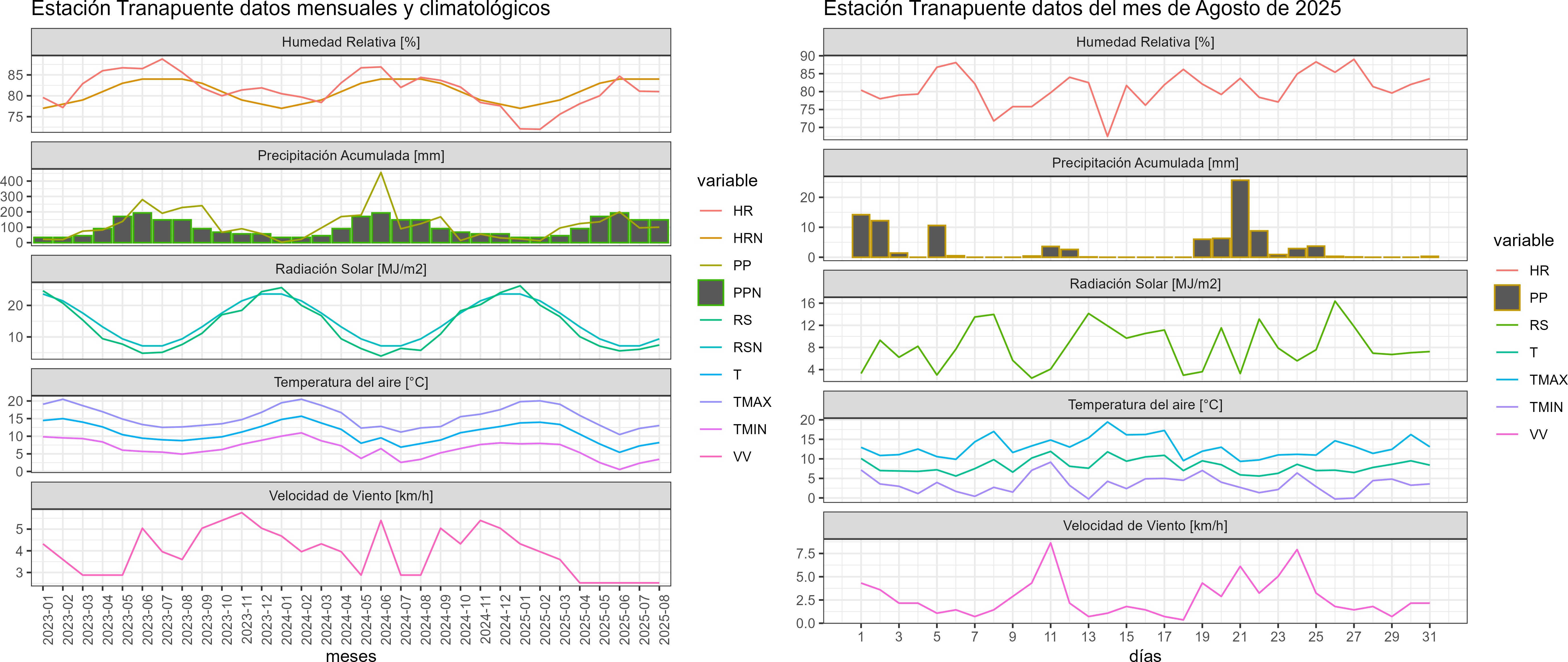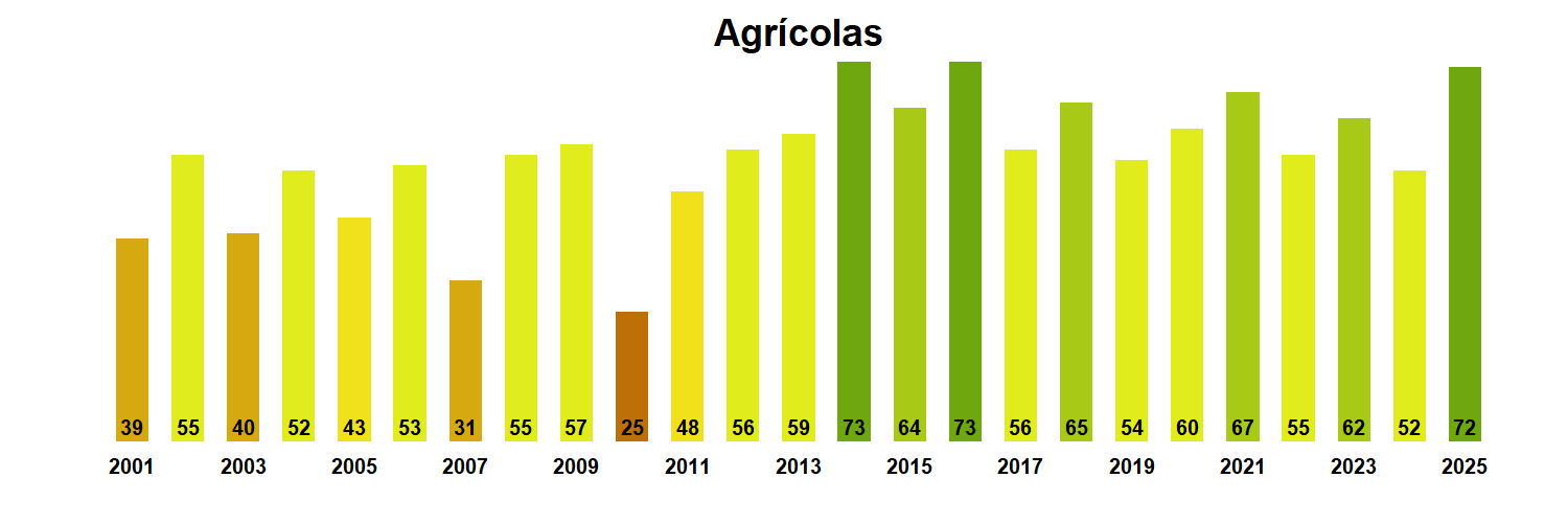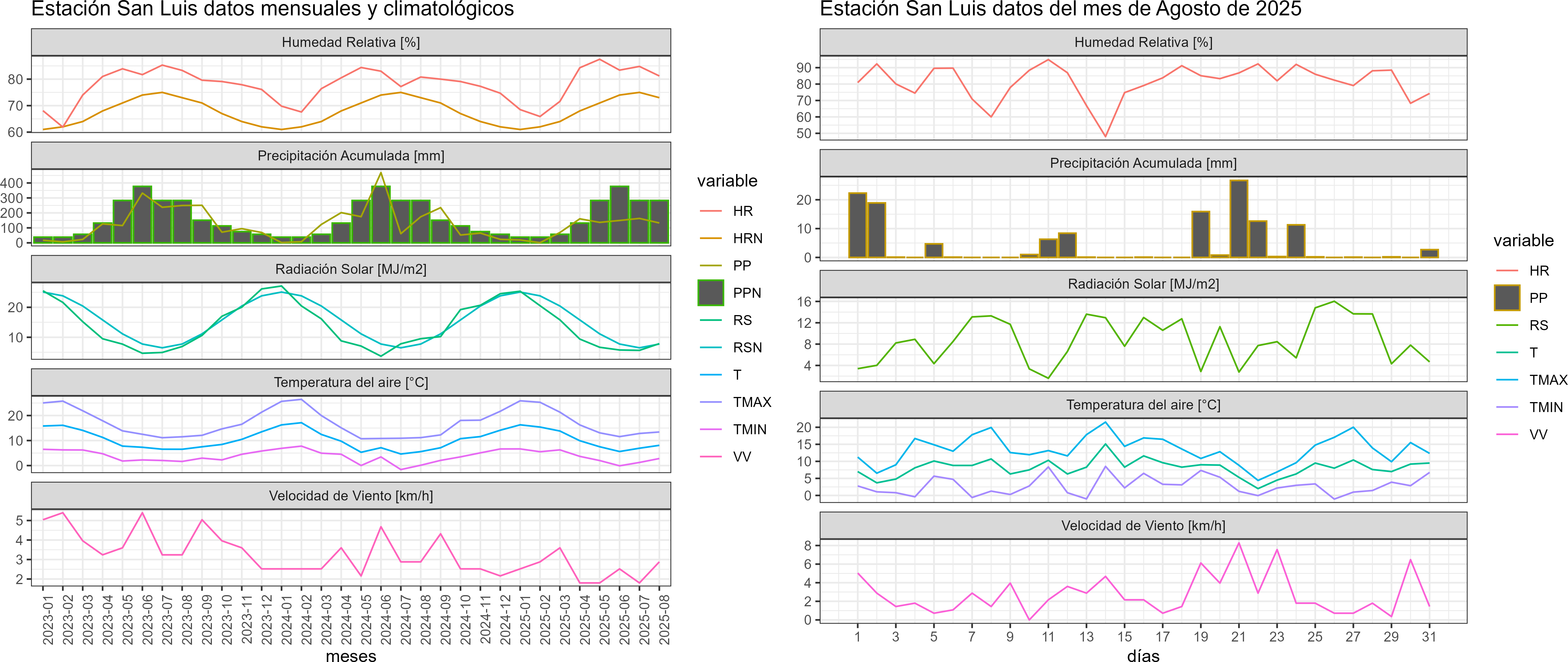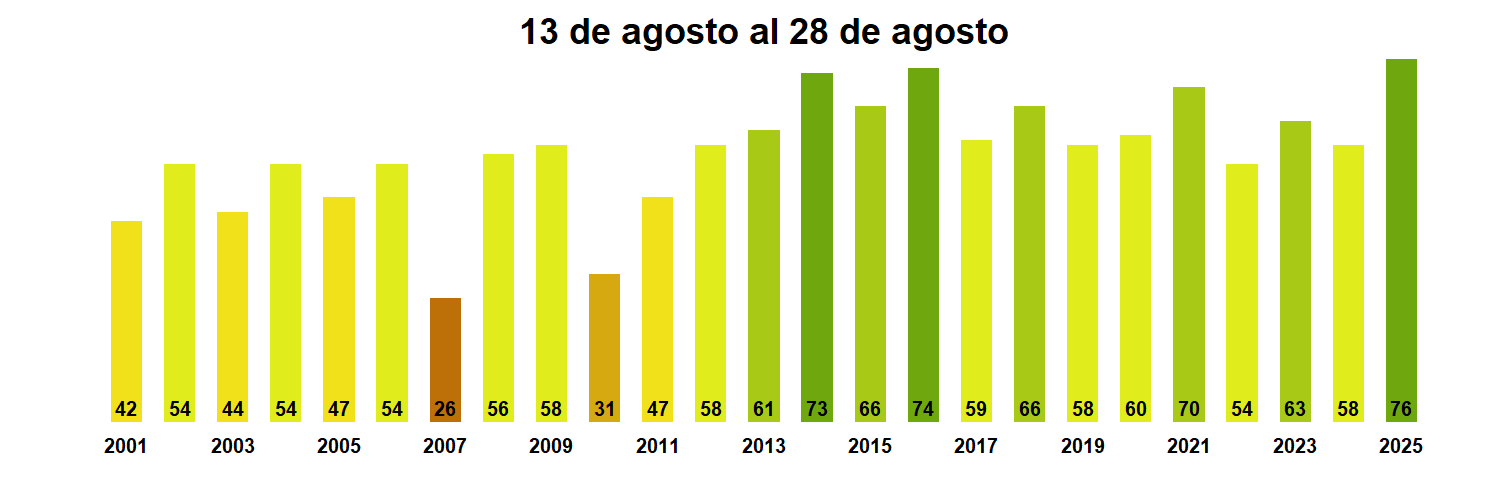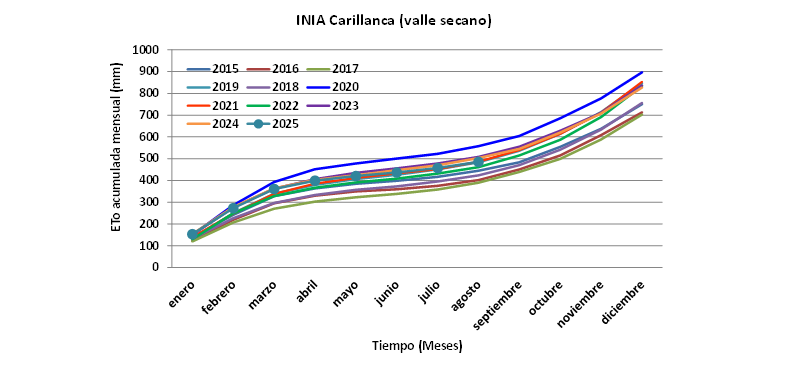 En palabras sencillas, la evapotranspiración en condiciones de referencia nos indica el consumo de agua de un pasto siempre verde en activo crecimiento y bajo condiciones óptimas de manejo agronómico. Así, durante todo el año 2020 e inicios del 2023 y 2024, se ha observado que el acumulado ha sido el más seco comparado a los últimos 11 años evaluados. Sin embargo, el valor de ETo acumulado hasta el mes de agosto 2025 ha sido el quinto más alto registrado entre los años 2015 y 2025. Por otro lado, el valor de mayor a menor ETo acumulada en agosto 2025 fue de 557,1 mm; 507,9 mm; 502,6 mm; 486,1 mm; 485,4 mm; 483,4 mm; 461,0 mm; 444,3 mm; 423,4 mm; 401,3 y 389,7 mm para los años 2020, 2023, 2024, 2021, 2025, 2019, 2022, 2015, 2018, 2016 y 2017, respectivamente (Figura 6). Finalmente, la tendencia del valor en el mes de agosto 2025 está entre los años 2019 y 2024.