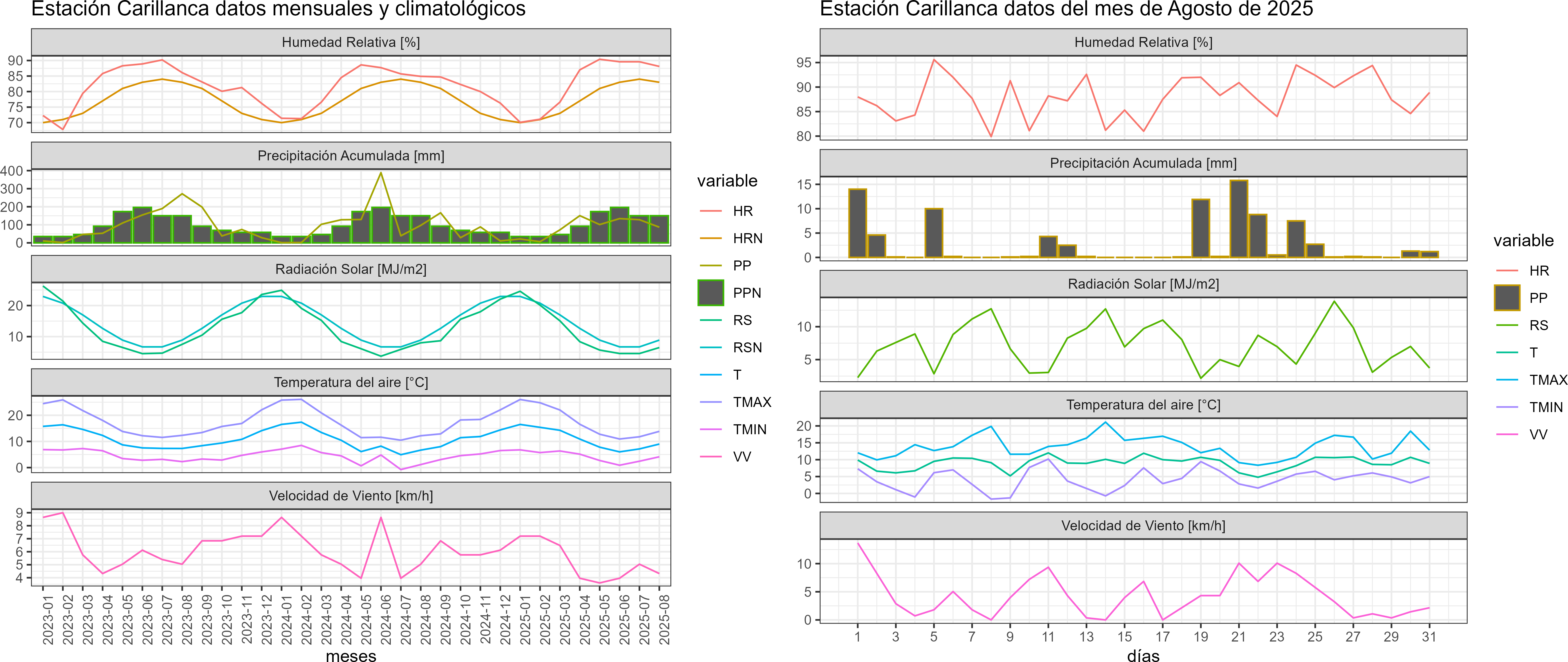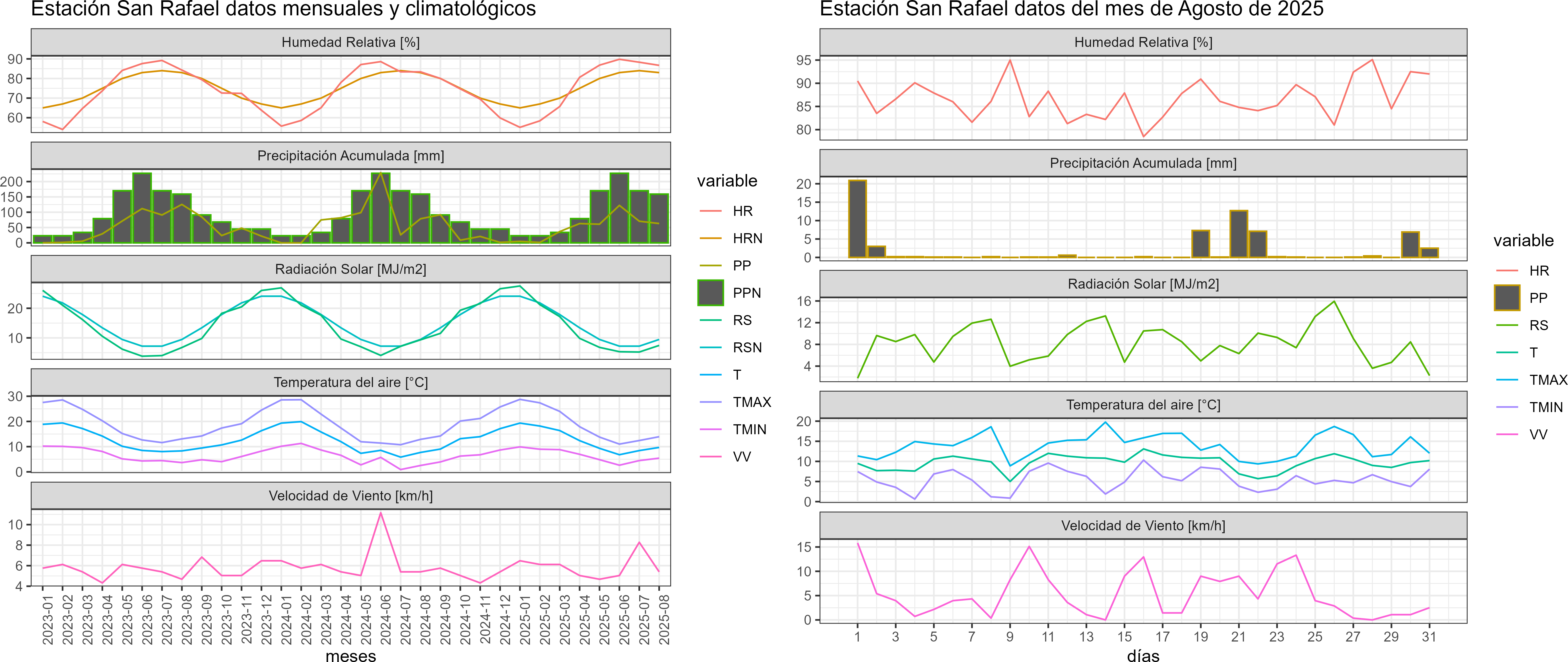 Complementariamente, la ETo máxima (Figura 7) evidenciada en el mes de agosto 2025 de mayor a menor fue de 2,20; 2,19; 1,90; 1,87; 1,84; 1,83; 1,75; 1,70; 1,50; 1,48 y 1,47 mm/día para los años 2020, 2021, 2018, 2024, 2015, 2022, 2023, 2019, 2017, 2016 y 2015, respectivamente. Así, la cantidad de agua máxima que estuvo evapotranspirando el pasto en referencia en el mes de agosto 2025 ha estado variando entre 1,47 y 2,20 mm/día (14,7 y 22,0 m3/ha/día) para los 11 años evaluados. Finalmente, el mes de agosto del 2025 fue seco ya que el valor de ETo máxima estuvo muy por debajo de lo registrado desde el año 2015, estando en el último lugar de los 11 años evaluados.