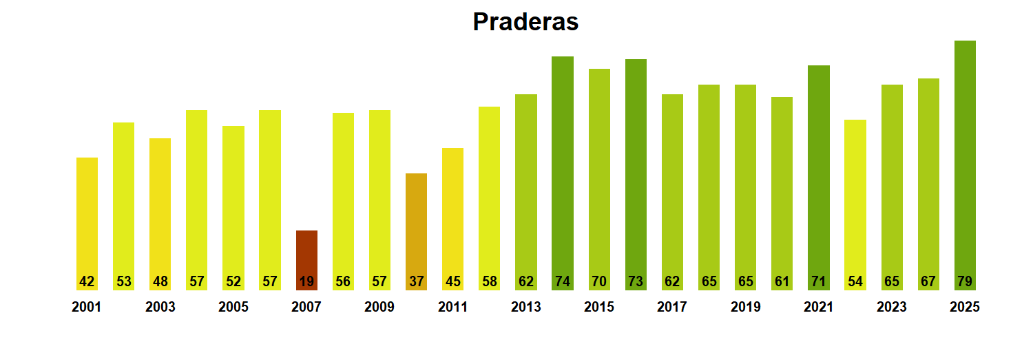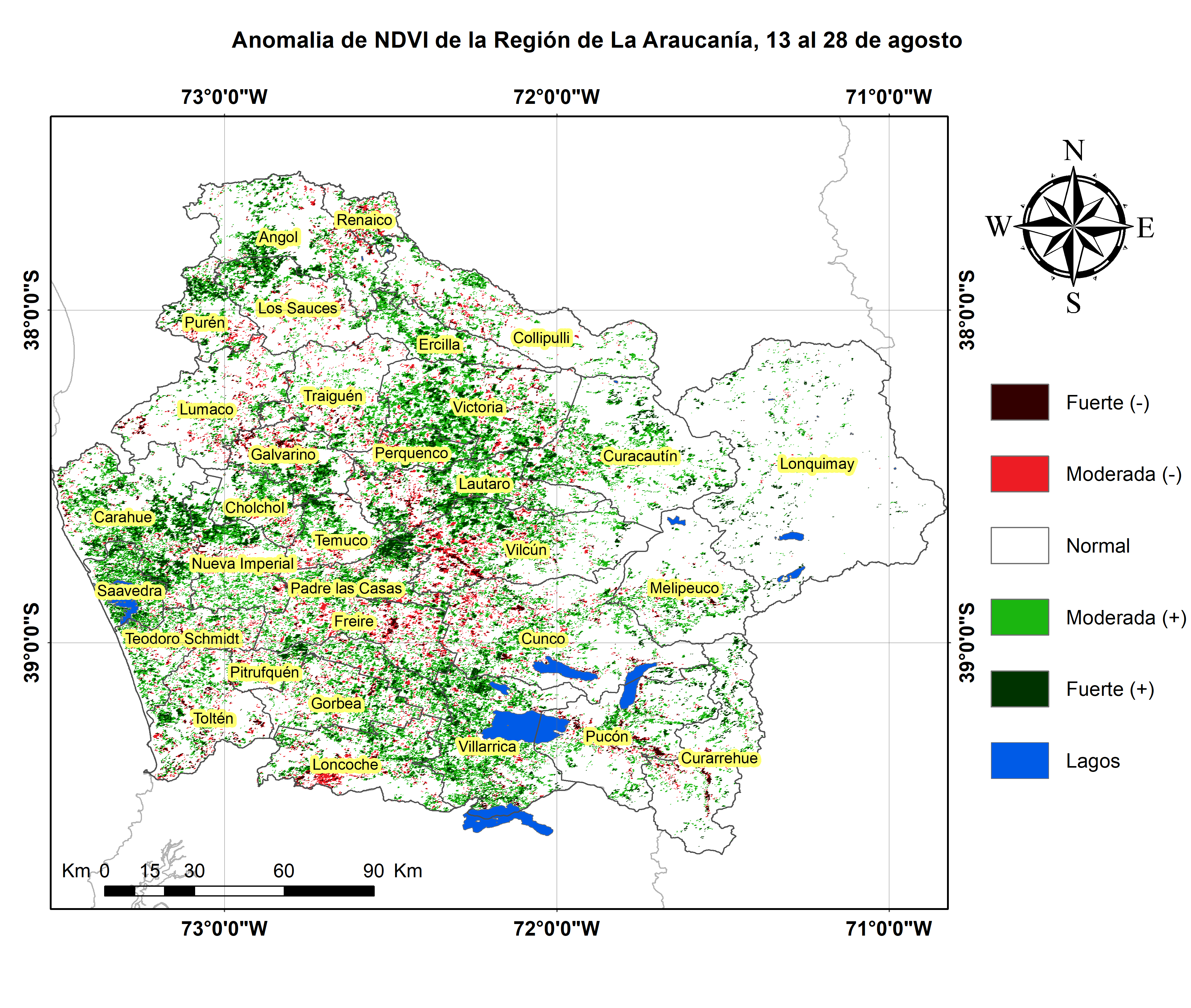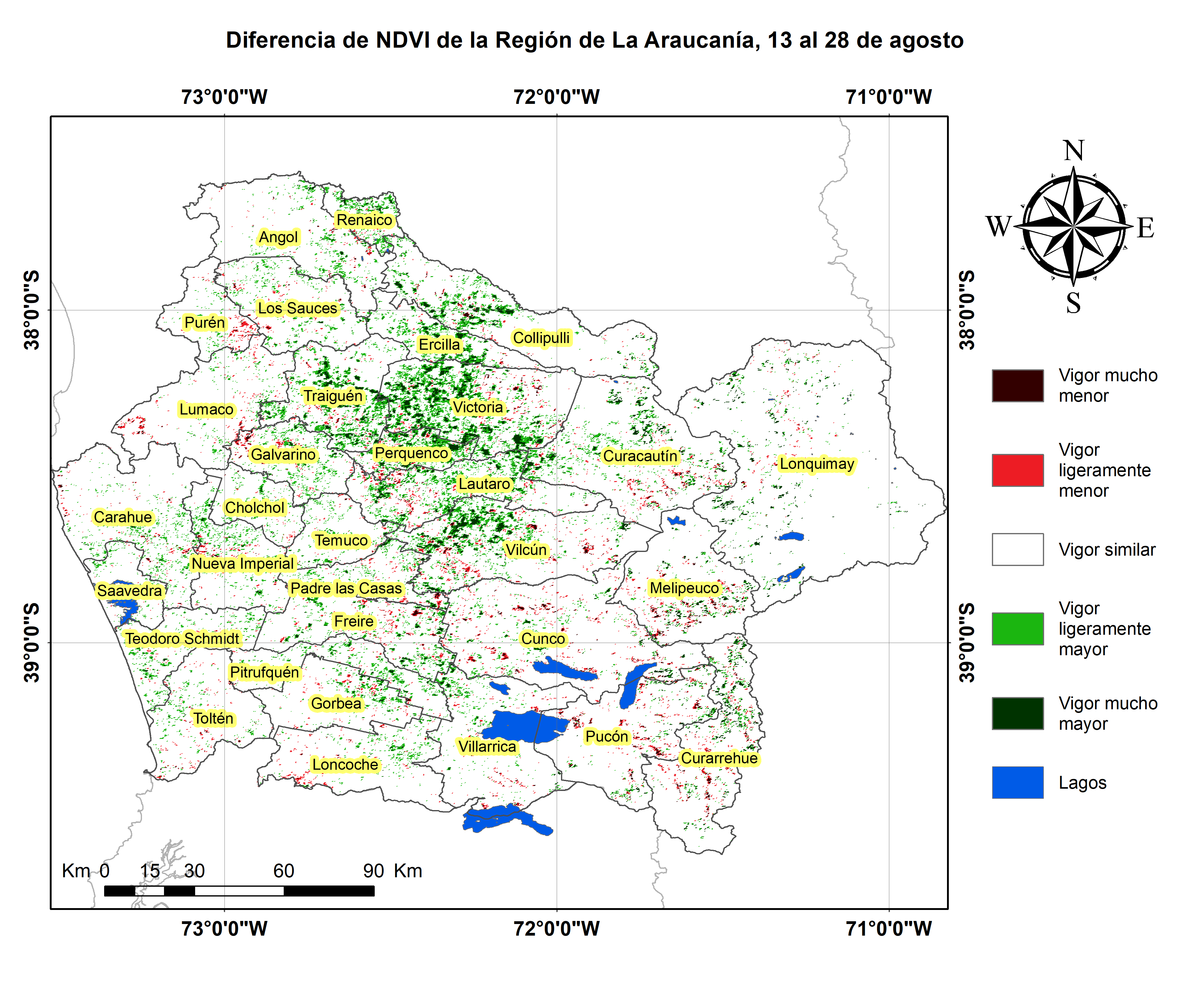 Respecto de la respuesta fisiológica de las plantas al efecto del clima, las imágenes satelitales reflejan la magnitud del crecimiento o disminución de la cobertura vegetal en esta época del año mediante el índice de vegetación NDVI (Desviación Normalizada del Índice de Vegetación).