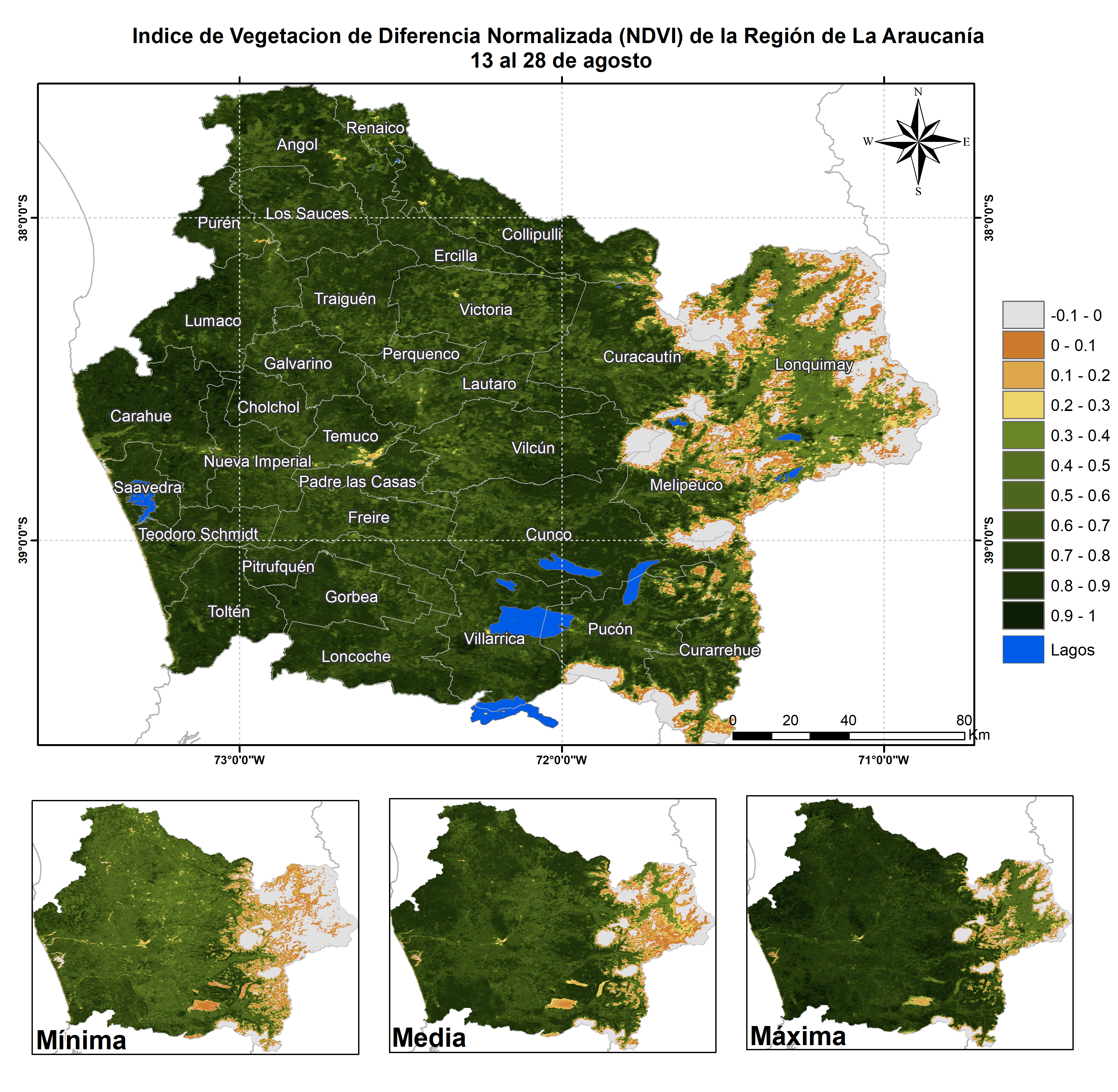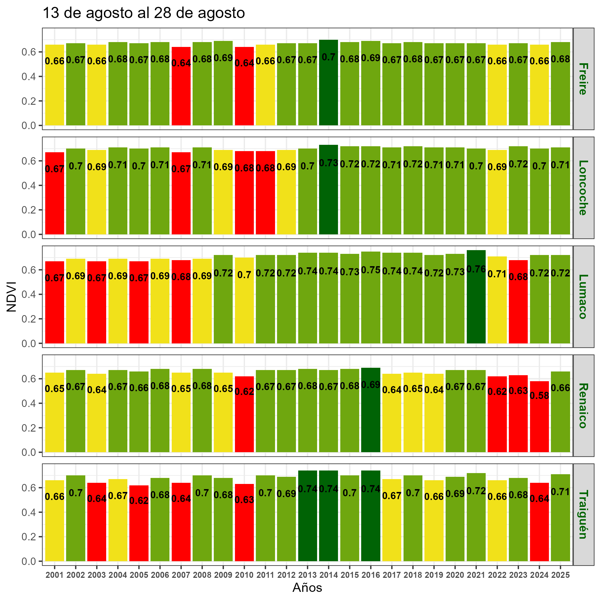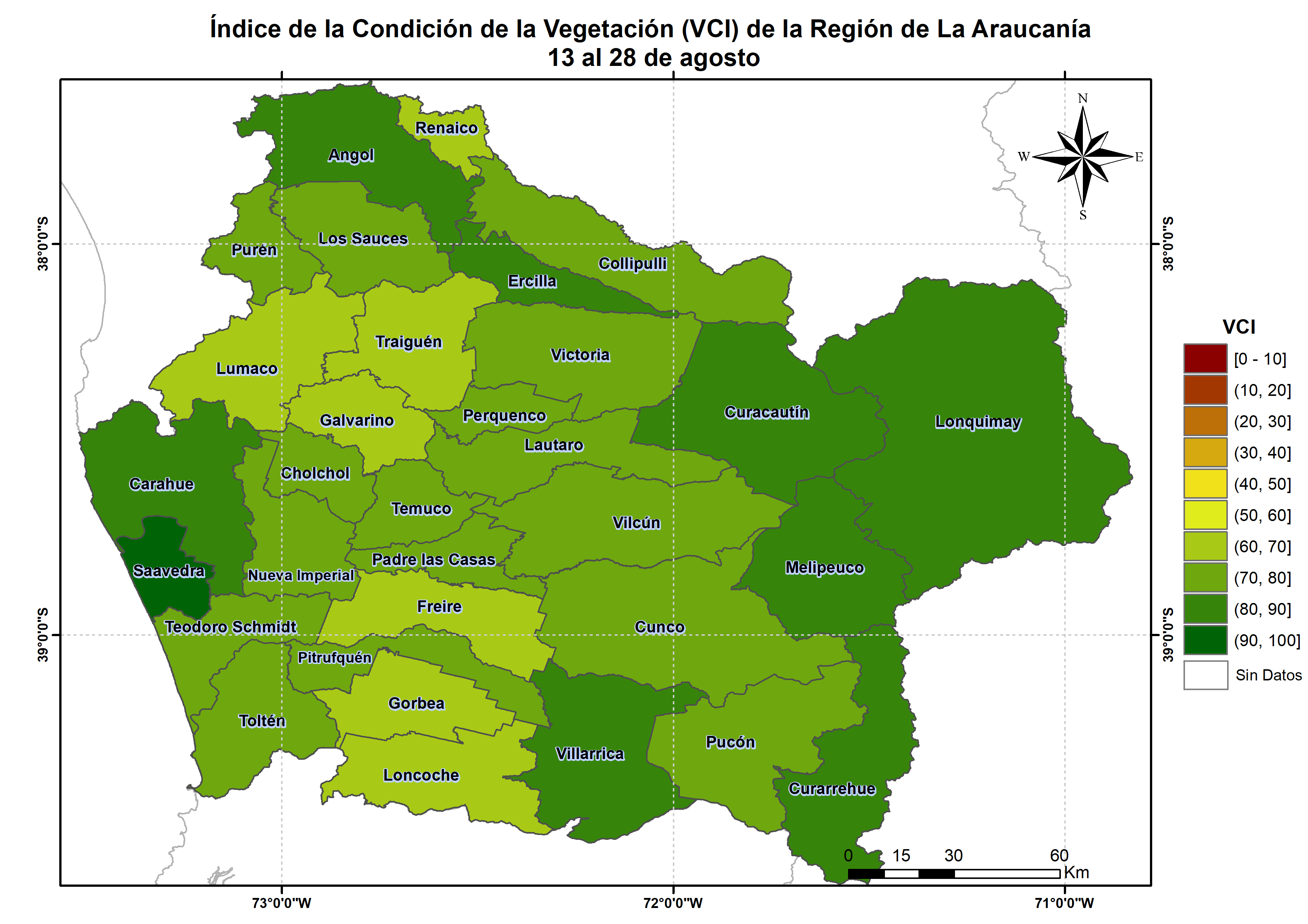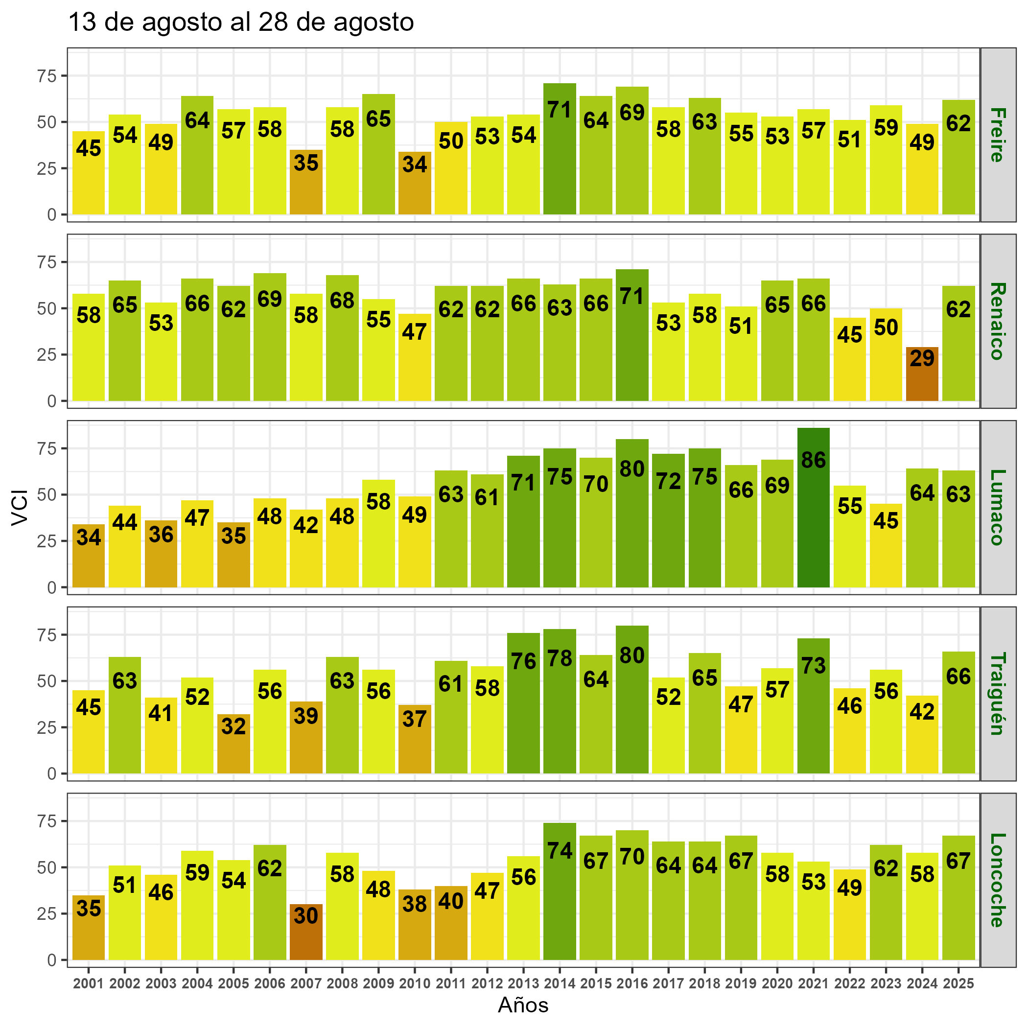 En términos globales la Región presentó un valor mediano de VCI de 76% para el período comprendido desde el 13 al 28 de agosto. A igual período del año pasado presentaba un VCI de 58% (Fig. 1). De acuerdo a la Tabla 1 la Región de La Araucanía, en términos globales presenta una condición Favorable.
