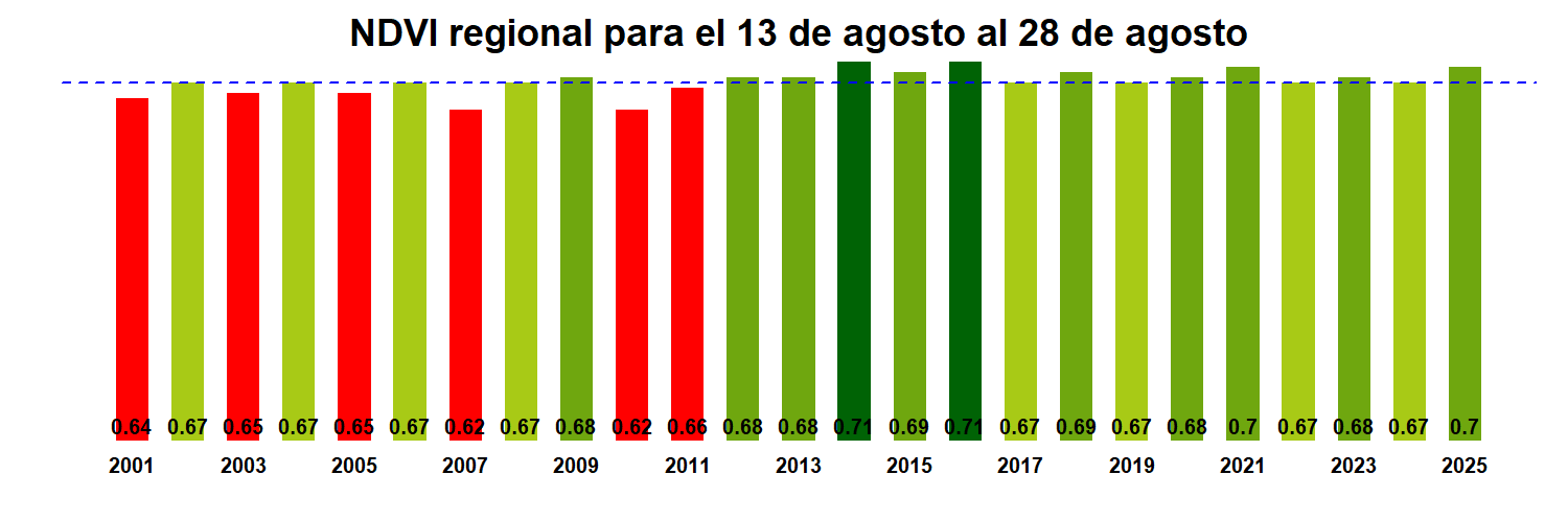 Para esta quincena se observa un NDVI promedio regional de 0.7 mientras el año pasado había sido de 0.67. El valor promedio histórico para esta región, en este período del año es de 0.67.