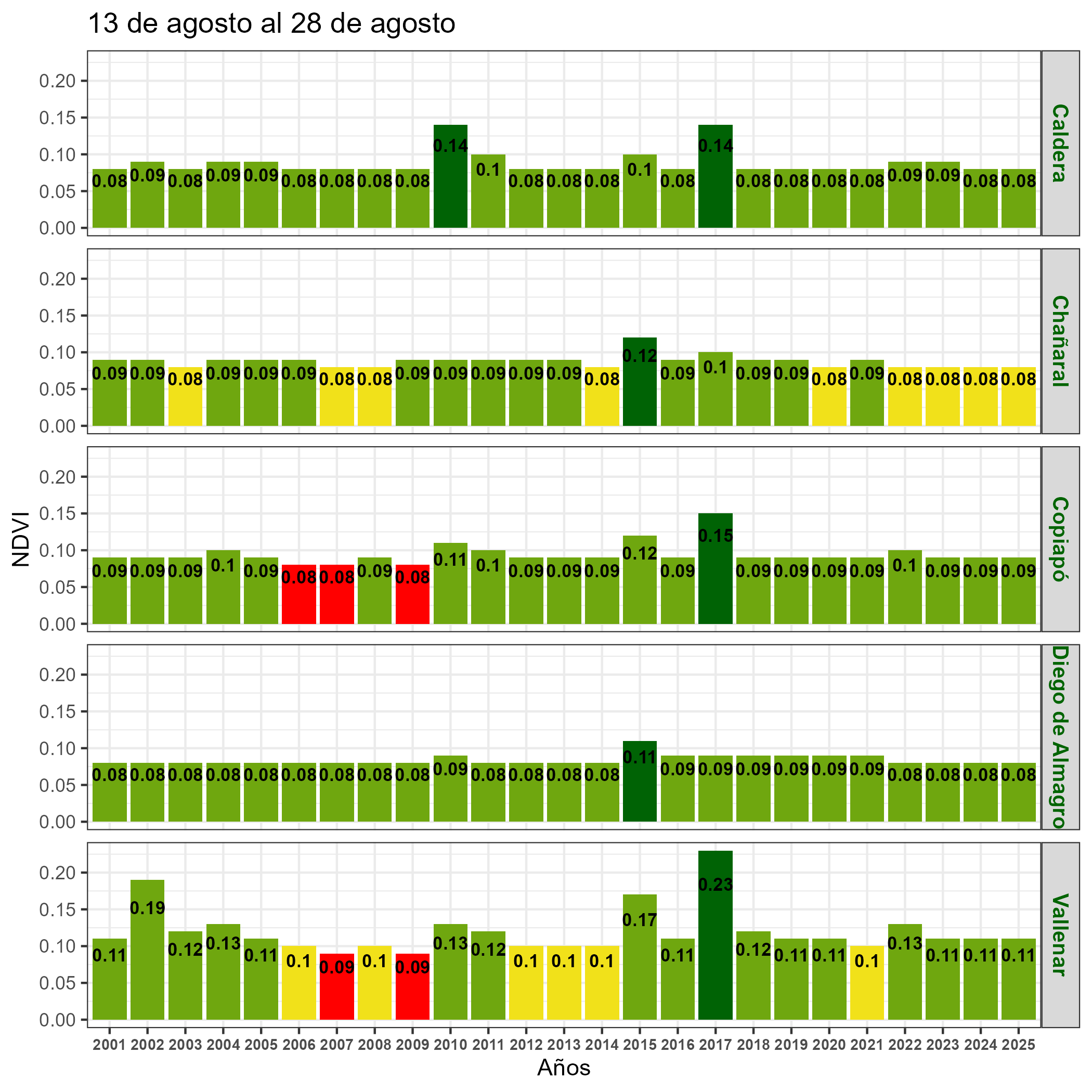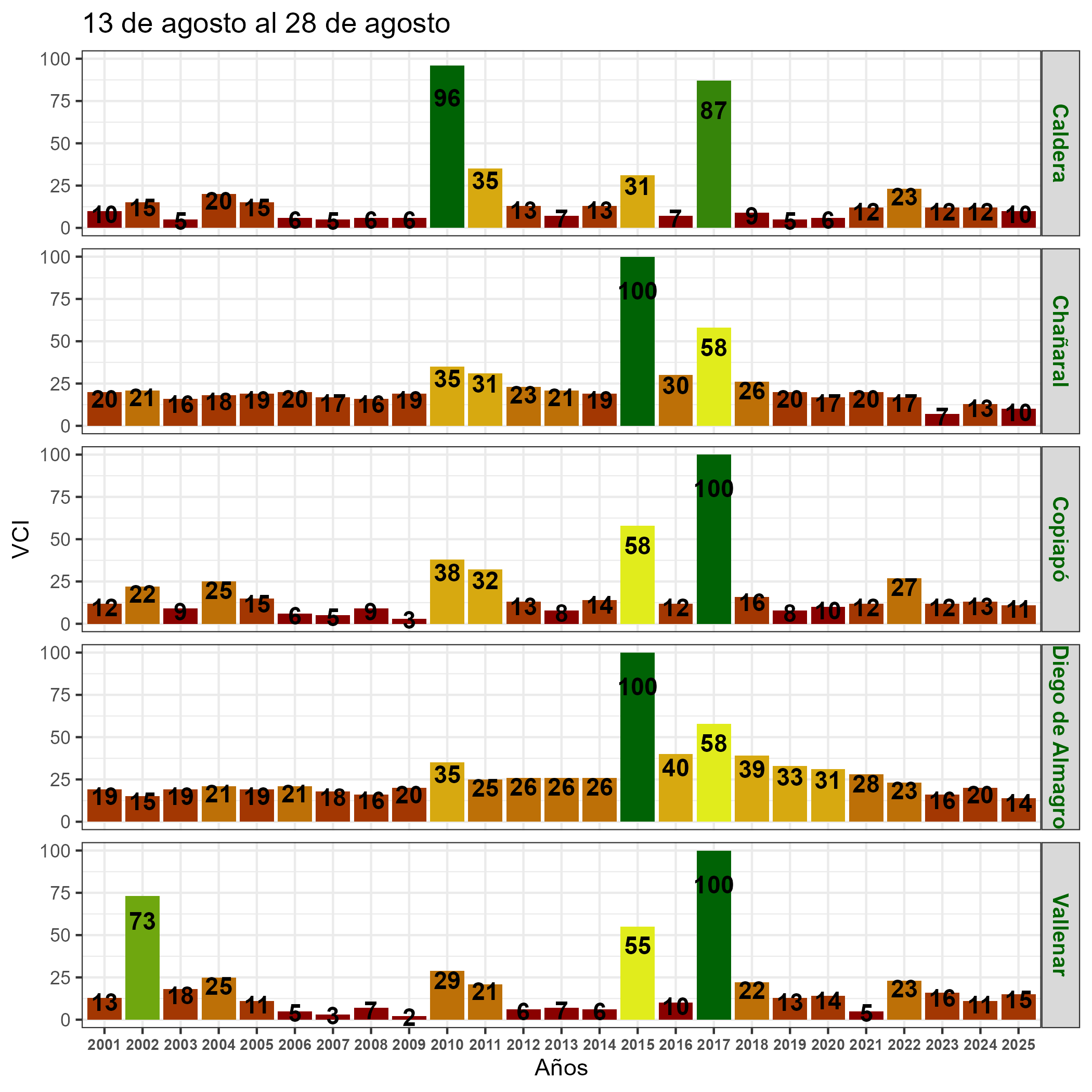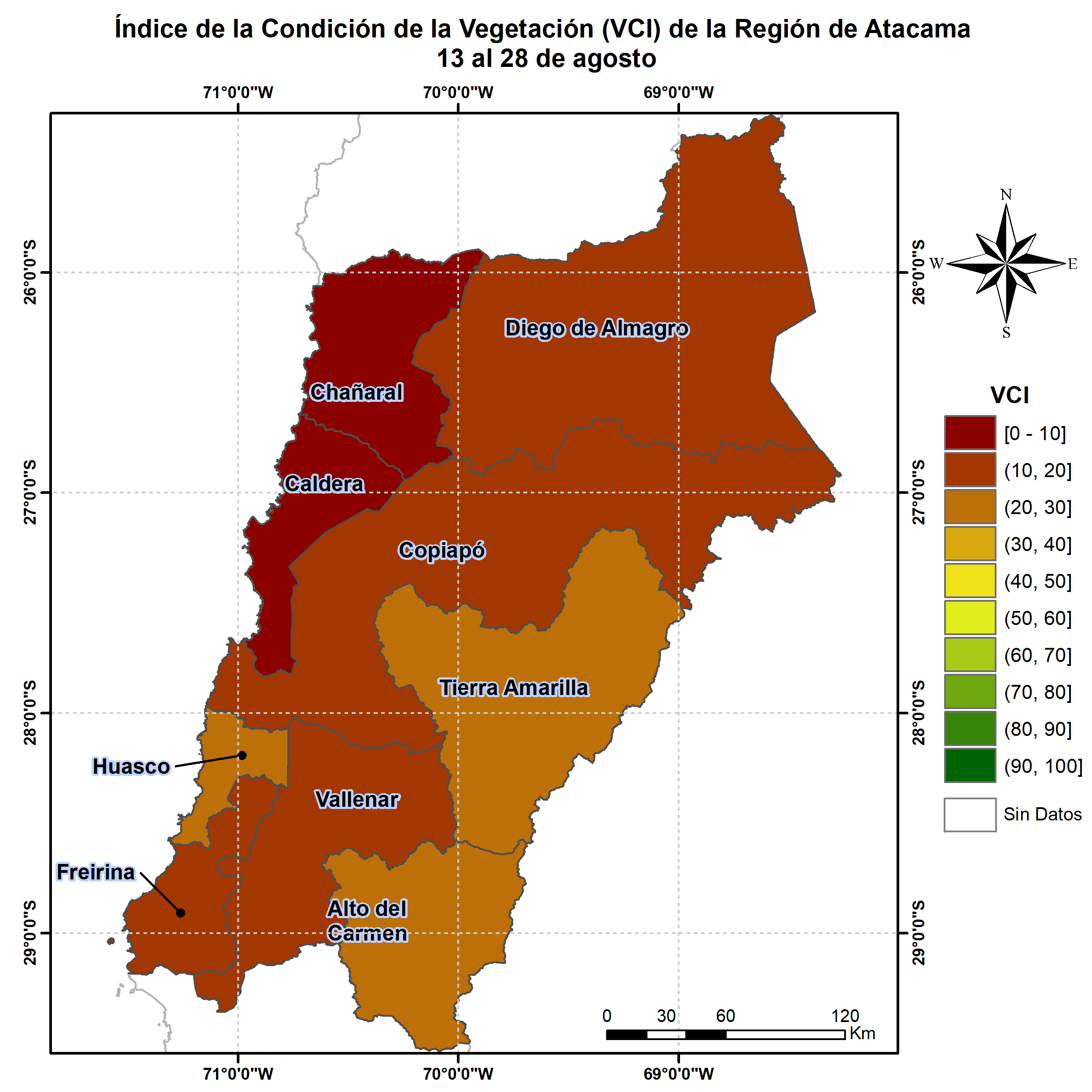 En términos globales la Región presentó un valor mediano de VCI de 17% para el período comprendido desde el 13 al 28 de agosto. A igual período del año pasado presentaba un VCI de 17% (Fig. 1). De acuerdo a la Tabla 1 la Región de Atacama, en términos globales presenta una condición Desfavorable severa.
