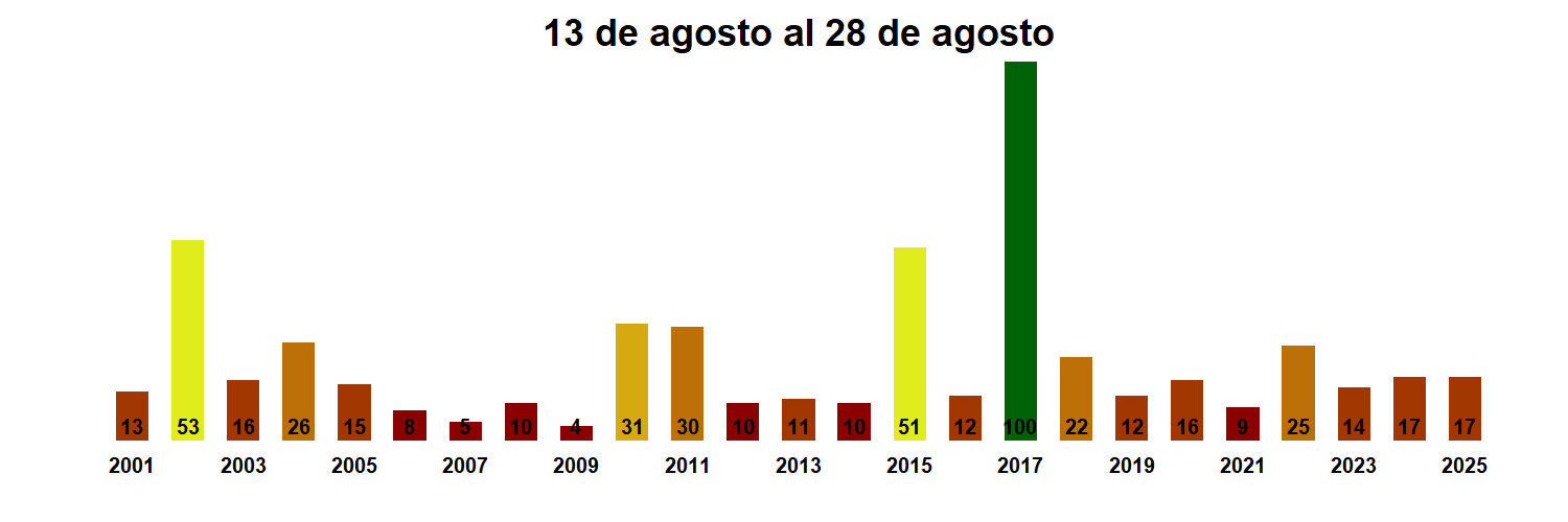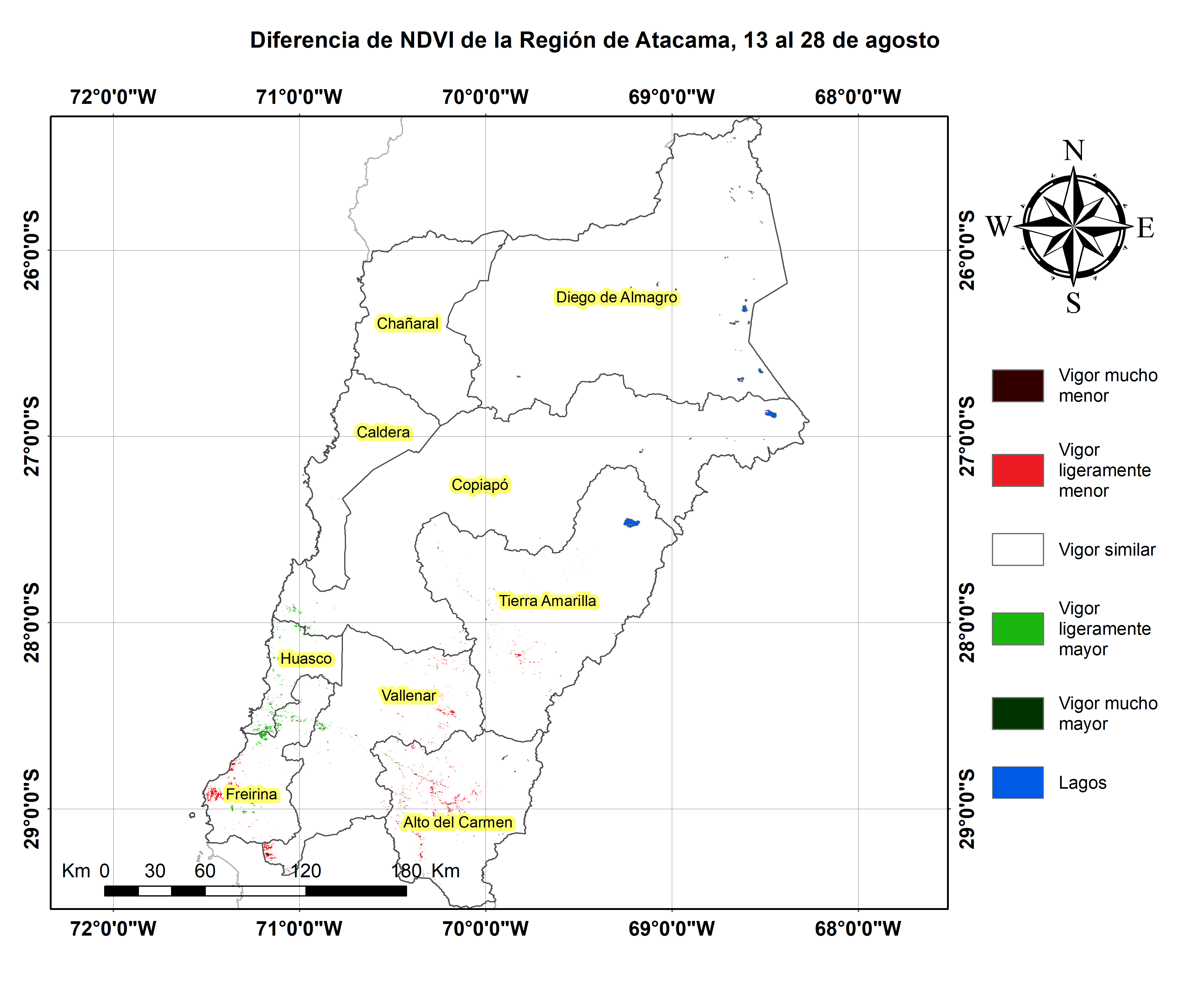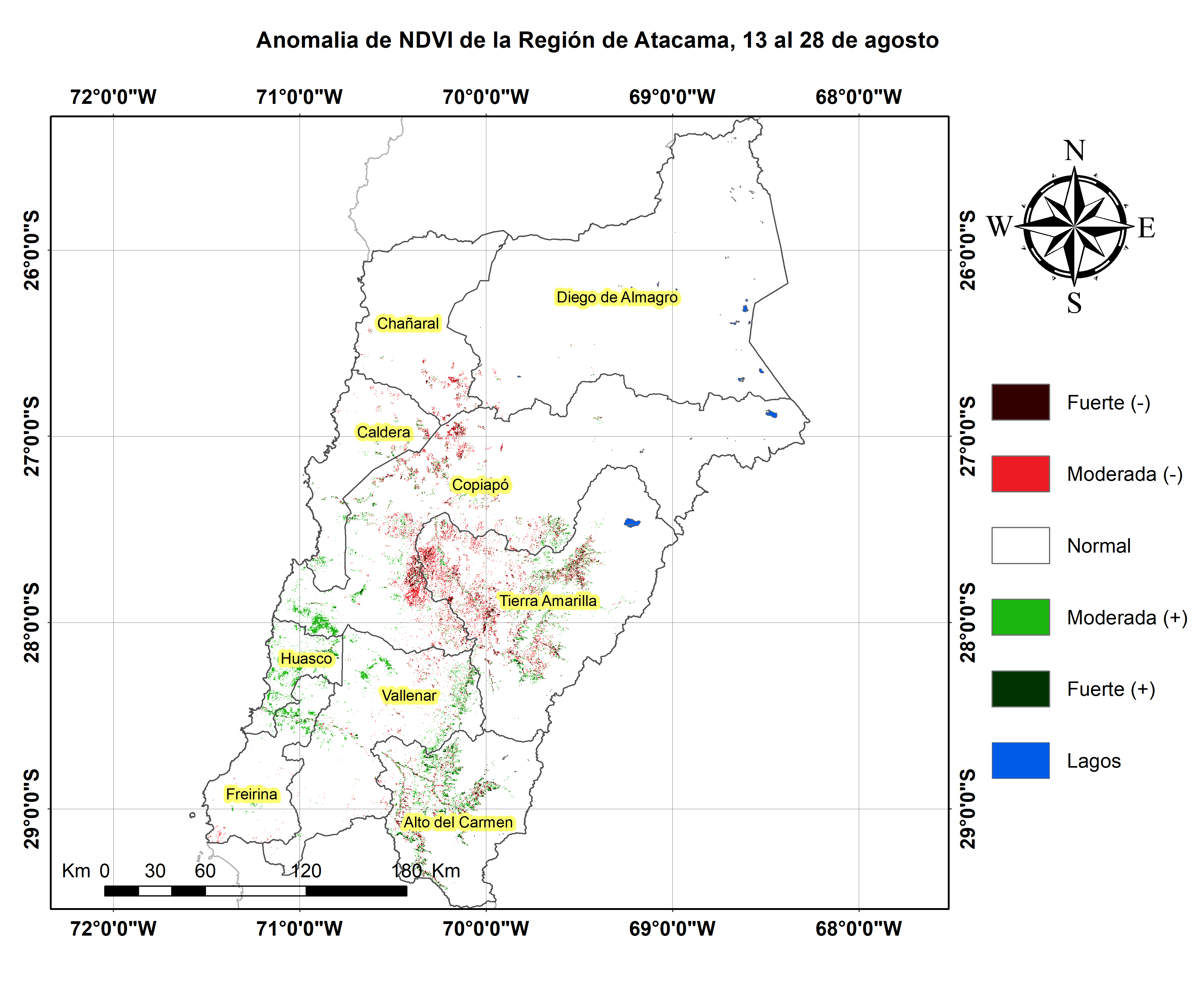 En términos globales la Región presentó un valor mediano de VCI de 17% para el período comprendido desde el 13 al 28 de agosto. A igual período del año pasado presentaba un VCI de 17% (Fig. 1). De acuerdo a la Tabla 1 la Región de Atacama, en términos globales presenta una condición Desfavorable severa.