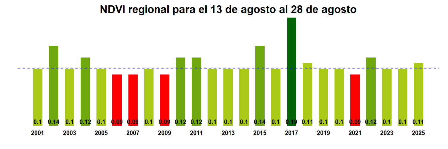 Para esta quincena se observa un NDVI promedio regional de 0.11 mientras el año pasado había sido de 0.1. El valor promedio histórico para esta región, en este período del año es de 0.11.