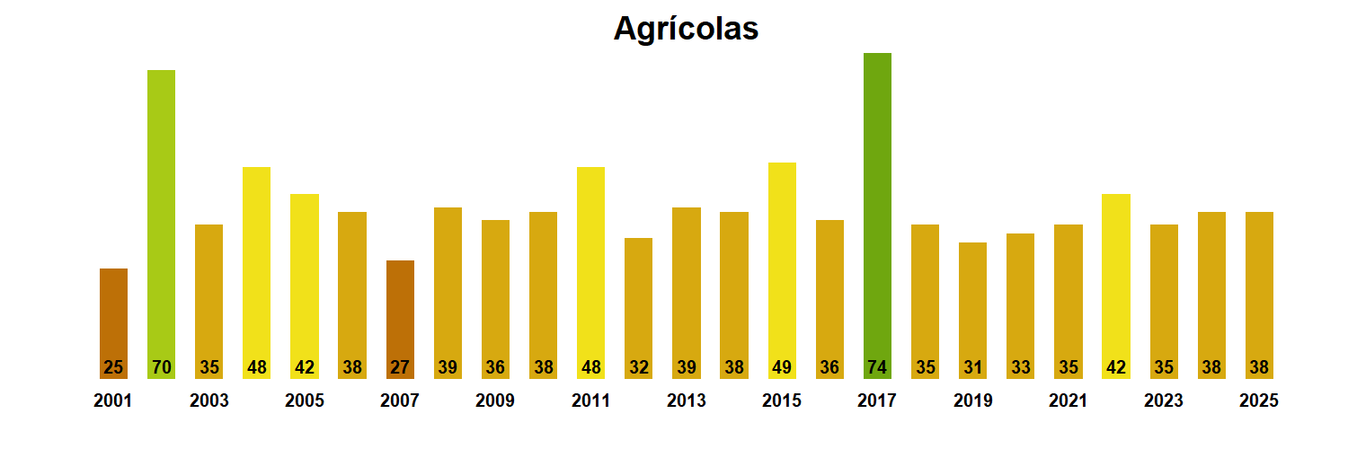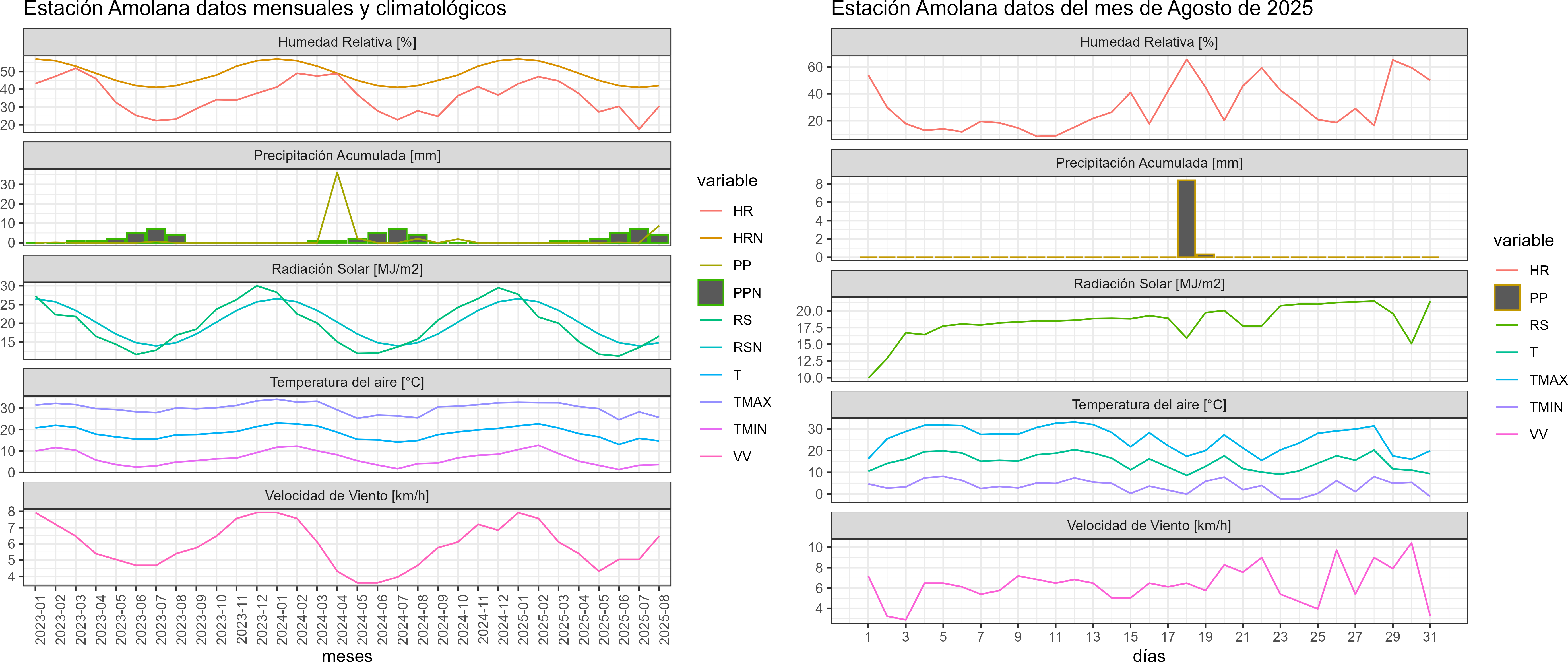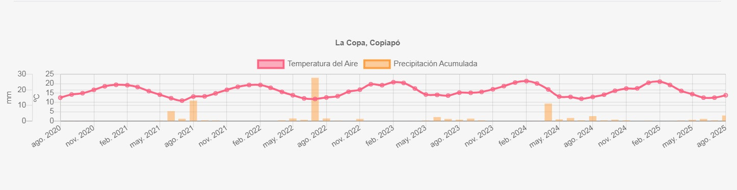 La estación Amolana corresponde al distrito agroclimático 3-3. Para este distrito climático la temperatura mínima, media y máxima climatológicas alcanzan los 5.5°C, 14.3°C y 23.2°C respectivamente. Por su parte, respecto a las temperaturas medidas durante el mes de agosto en la estación: la temperatura mínima alcanzo los 3.7°C (-1.8°C bajo la climatológica), la temperatura media 14.8°C (0.5°C sobre la climatológica) y la temperatura máxima llegó a los 25.6°C (2.4°C sobre la climatológica). En el mes de agosto se registró una pluviometría de 8.7 mm, lo cual representa un 108.7% con respecto al mismo mes de un año normal. De enero a agosto se ha registrado un total acumulado de 8.9 mm, en circunstancias que un año normal registraría a la fecha 75 mm, lo que representa un déficit de 88.1%. A la misma fecha, durante el año 2024 la precipitación alcanzaba los 2 mm.